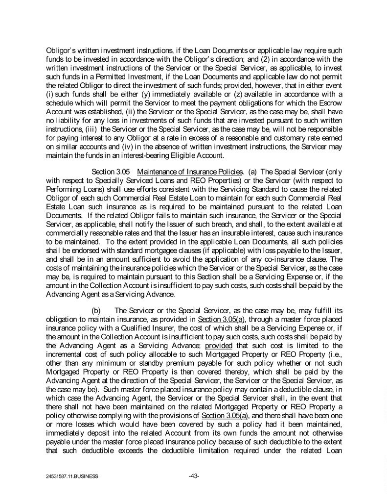 Obligor’s written investment instructions, if the Loan Documents or applicable law require such funds to be invested in accordance with the Obligor’s direction; and (2) in accordance with the written investment instructions of the Servicer or the Special Servicer, as applicable, to invest such funds in a Permitted Investment, if the Loan Documents and applicable law do not permit the related Obligor to direct the investment of such funds; provided, however, that in either event (i) such funds shall be either (y) immediately available or (z) available in accordance with a schedule which will permit the Servicer to meet the payment obligations for which the Escrow Account was established, (ii) the Servicer or the Special Servicer, as the case may be, shall have no liability for any loss in investments of such funds that are invested pursuant to such written instructions, (iii) the Servicer or the Special Servicer, as the case may be, will not be responsible for paying interest to any Obligor at a rate in excess of a reasonable and customary rate earned on similar accounts and (iv) in the absence of written investment instructions, the Servicer may maintain the funds in an interest-bearing Eligible Account. Section 3.05 Maintenance of Insurance Policies. (a) The Special Servicer (only with respect to Specially Serviced Loans and REO Properties) or the Servicer (with respect to Performing Loans) shall use efforts consistent with the Servicing Standard to cause the related Obligor of each such Commercial Real Estate Loan to maintain for each such Commercial Real Estate Loan such insurance as is required to be maintained pursuant to the related Loan Documents. If the related Obligor fails to maintain such insurance, the Servicer or the Special Servicer, as applicable, shall notify the Issuer of such breach, and shall, to the extent available at commercially reasonable rates and that the Issuer has an insurable interest, cause such insurance to be maintained. To the extent provided in the applicable Loan Documents, all such policies shall be endorsed with standard mortgagee clauses (if applicable) with loss payable to the Issuer, and shall be in an amount sufficient to avoid the application of any co-insurance clause. The costs of maintaining the insurance policies which the Servicer or the Special Servicer, as the case may be, is required to maintain pursuant to this Section shall be a Servicing Expense or, if the amount in the Collection Account is insufficient to pay such costs, such costs shall be paid by the Advancing Agent as a Servicing Advance. (b) The Servicer or the Special Servicer, as the case may be, may fulfill its obligation to maintain insurance, as provided in Section 3.05(a), through a master force placed insurance policy with a Qualified Insurer, the cost of which shall be a Servicing Expense or, if the amount in the Collection Account is insufficient to pay such costs, such costs shall be paid by the Advancing Agent as a Servicing Advance; provided that such cost is limited to the incremental cost of such policy allocable to such Mortgaged Property or REO Property (i.e., other than any minimum or standby premium payable for such policy whether or not such Mortgaged Property or REO Property is then covered thereby, which shall be paid by the Advancing Agent at the direction of the Special Servicer, the Servicer or the Special Servicer, as the case may be). Such master force placed insurance policy may contain a deductible clause, in which case the Advancing Agent, the Servicer or the Special Servicer shall, in the event that there shall not have been maintained on the related Mortgaged Property or REO Property a policy otherwise complying with the provisions of Section 3.05(a), and there shall have been one or more losses which would have been covered by such a policy had it been maintained, immediately deposit into the related Account from its own funds the amount not otherwise payable under the master force placed insurance policy because of such deductible to the extent that such deductible exceeds the deductible limitation required under the related Loan 24531587.11.BUSINESS -43-