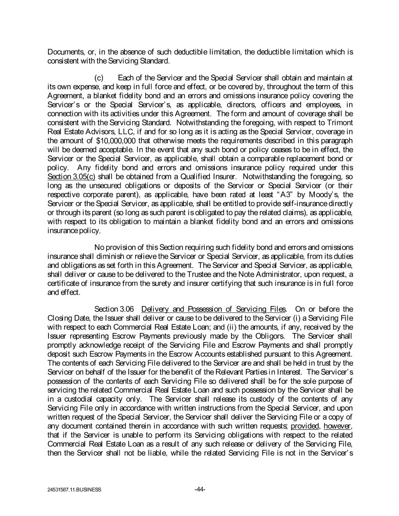 Documents, or, in the absence of such deductible limitation, the deductible limitation which is consistent with the Servicing Standard. (c) Each of the Servicer and the Special Servicer shall obtain and maintain at its own expense, and keep in full force and effect, or be covered by, throughout the term of this Agreement, a blanket fidelity bond and an errors and omissions insurance policy covering the Servicer’s or the Special Servicer’s, as applicable, directors, officers and employees, in connection with its activities under this Agreement. The form and amount of coverage shall be consistent with the Servicing Standard. Notwithstanding the foregoing, with respect to Trimont Real Estate Advisors, LLC, if and for so long as it is acting as the Special Servicer, coverage in the amount of $10,000,000 that otherwise meets the requirements described in this paragraph will be deemed acceptable. In the event that any such bond or policy ceases to be in effect, the Servicer or the Special Servicer, as applicable, shall obtain a comparable replacement bond or policy. Any fidelity bond and errors and omissions insurance policy required under this Section 3.05(c) shall be obtained from a Qualified Insurer. Notwithstanding the foregoing, so long as the unsecured obligations or deposits of the Servicer or Special Servicer (or their respective corporate parent), as applicable, have been rated at least “A3” by Moody’s, the Servicer or the Special Servicer, as applicable, shall be entitled to provide self-insurance directly or through its parent (so long as such parent is obligated to pay the related claims), as applicable, with respect to its obligation to maintain a blanket fidelity bond and an errors and omissions insurance policy. No provision of this Section requiring such fidelity bond and errors and omissions insurance shall diminish or relieve the Servicer or Special Servicer, as applicable, from its duties and obligations as set forth in this Agreement. The Servicer and Special Servicer, as applicable, shall deliver or cause to be delivered to the Trustee and the Note Administrator, upon request, a certificate of insurance from the surety and insurer certifying that such insurance is in full force and effect. Section 3.06 Delivery and Possession of Servicing Files. On or before the Closing Date, the Issuer shall deliver or cause to be delivered to the Servicer (i) a Servicing File with respect to each Commercial Real Estate Loan; and (ii) the amounts, if any, received by the Issuer representing Escrow Payments previously made by the Obligors. The Servicer shall promptly acknowledge receipt of the Servicing File and Escrow Payments and shall promptly deposit such Escrow Payments in the Escrow Accounts established pursuant to this Agreement. The contents of each Servicing File delivered to the Servicer are and shall be held in trust by the Servicer on behalf of the Issuer for the benefit of the Relevant Parties in Interest. The Servicer’s possession of the contents of each Servicing File so delivered shall be for the sole purpose of servicing the related Commercial Real Estate Loan and such possession by the Servicer shall be in a custodial capacity only. The Servicer shall release its custody of the contents of any Servicing File only in accordance with written instructions from the Special Servicer, and upon written request of the Special Servicer, the Servicer shall deliver the Servicing File or a copy of any document contained therein in accordance with such written requests; provided, however, that if the Servicer is unable to perform its Servicing obligations with respect to the related Commercial Real Estate Loan as a result of any such release or delivery of the Servicing File, then the Servicer shall not be liable, while the related Servicing File is not in the Servicer’s 24531587.11.BUSINESS -44-