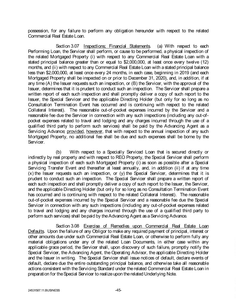possession, for any failure to perform any obligation hereunder with respect to the related Commercial Real Estate Loan. Section 3.07 Inspections; Financial Statements. (a) With respect to each Performing Loan, the Servicer shall perform, or cause to be performed, a physical inspection of the related Mortgaged Property (i) with respect to any Commercial Real Estate Loan with a stated principal balance greater than or equal to $2,000,000, at least once every twelve (12) months, and (ii) with respect to any Commercial Real Estate Loan with a stated principal balance less than $2,000,000, at least once every 24 months, in each case, beginning in 2019 (and each Mortgaged Property shall be inspected on or prior to December 31, 2020), and, in addition, if at any time (A) the Issuer requests such an inspection, or (B) the Servicer, with the approval of the Issuer, determines that it is prudent to conduct such an inspection. The Servicer shall prepare a written report of each such inspection and shall promptly deliver a copy of such report to the Issuer, the Special Servicer and the applicable Directing Holder (but only for so long as no Consultation Termination Event has occurred and is continuing with respect to the related Collateral Interest). The reasonable out-of-pocket expenses incurred by the Servicer and a reasonable fee due the Servicer in connection with any such inspections (including any out-of- pocket expenses related to travel and lodging and any charges incurred through the use of a qualified third party to perform such services) shall be paid by the Advancing Agent as a Servicing Advance; provided, however, that with respect to the annual inspection of any such Mortgaged Property, no additional fee shall be due and such expenses shall be borne by the Servicer. (b) With respect to a Specially Serviced Loan that is secured directly or indirectly by real property and with respect to REO Property, the Special Servicer shall perform a physical inspection of each such Mortgaged Property (i) as soon as possible after a Special Servicing Transfer Event and thereafter at least annually, and, in addition (ii) if at any time (x) the Issuer requests such an inspection, or (y) the Special Servicer, determines that it is prudent to conduct such an inspection. The Special Servicer shall prepare a written report of each such inspection and shall promptly deliver a copy of such report to the Issuer, the Servicer, and the applicable Directing Holder (but only for so long as no Consultation Termination Event has occurred and is continuing with respect to the related Collateral Interest). The reasonable out-of-pocket expenses incurred by the Special Servicer and a reasonable fee due the Special Servicer in connection with any such inspections (including any out-of-pocket expenses related to travel and lodging and any charges incurred through the use of a qualified third party to perform such services) shall be paid by the Advancing Agent as a Servicing Advance. Section 3.08 Exercise of Remedies upon Commercial Real Estate Loan Defaults. Upon the failure of any Obligor to make any required payment of principal, interest or other amounts due under such Commercial Real Estate Loan, or otherwise to perform fully any material obligations under any of the related Loan Documents, in either case within any applicable grace period, the Servicer shall, upon discovery of such failure, promptly notify the Special Servicer, the Advancing Agent, the Operating Advisor, the applicable Directing Holder and the Issuer in writing. The Special Servicer shall issue notices of default, declare events of default, declare due the entire outstanding principal balance, and otherwise take all reasonable actions consistent with the Servicing Standard under the related Commercial Real Estate Loan in preparation for the Special Servicer to realize upon the related Underlying Note. 24531587.11.BUSINESS -45-