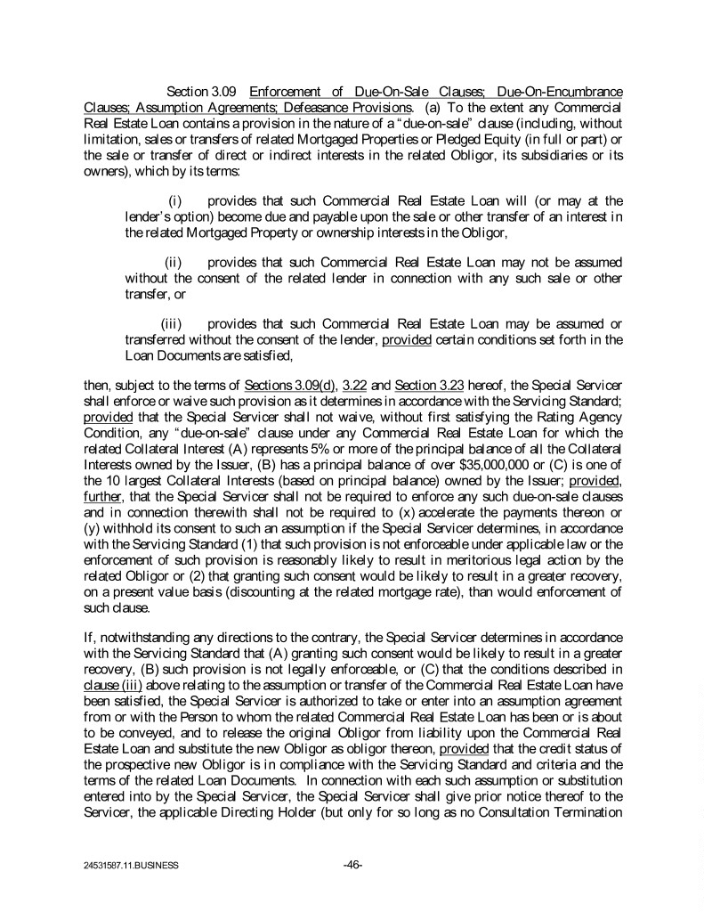 Section 3.09 Enforcement of Due-On-Sale Clauses; Due-On-Encumbrance Clauses; Assumption Agreements; Defeasance Provisions. (a) To the extent any Commercial Real Estate Loan contains a provision in the nature of a “due-on-sale” clause (including, without limitation, sales or transfers of related Mortgaged Properties or Pledged Equity (in full or part) or the sale or transfer of direct or indirect interests in the related Obligor, its subsidiaries or its owners), which by its terms: (i) provides that such Commercial Real Estate Loan will (or may at the lender’s option) become due and payable upon the sale or other transfer of an interest in the related Mortgaged Property or ownership interests in the Obligor, (ii) provides that such Commercial Real Estate Loan may not be assumed without the consent of the related lender in connection with any such sale or other transfer, or (iii) provides that such Commercial Real Estate Loan may be assumed or transferred without the consent of the lender, provided certain conditions set forth in the Loan Documents are satisfied, then, subject to the terms of Sections 3.09(d), 3.22 and Section 3.23 hereof, the Special Servicer shall enforce or waive such provision as it determines in accordance with the Servicing Standard; provided that the Special Servicer shall not waive, without first satisfying the Rating Agency Condition, any “due-on-sale” clause under any Commercial Real Estate Loan for which the related Collateral Interest (A) represents 5% or more of the principal balance of all the Collateral Interests owned by the Issuer, (B) has a principal balance of over $35,000,000 or (C) is one of the 10 largest Collateral Interests (based on principal balance) owned by the Issuer; provided, further, that the Special Servicer shall not be required to enforce any such due-on-sale clauses and in connection therewith shall not be required to (x) accelerate the payments thereon or (y) withhold its consent to such an assumption if the Special Servicer determines, in accordance with the Servicing Standard (1) that such provision is not enforceable under applicable law or the enforcement of such provision is reasonably likely to result in meritorious legal action by the related Obligor or (2) that granting such consent would be likely to result in a greater recovery, on a present value basis (discounting at the related mortgage rate), than would enforcement of such clause. If, notwithstanding any directions to the contrary, the Special Servicer determines in accordance with the Servicing Standard that (A) granting such consent would be likely to result in a greater recovery, (B) such provision is not legally enforceable, or (C) that the conditions described in clause (iii) above relating to the assumption or transfer of the Commercial Real Estate Loan have been satisfied, the Special Servicer is authorized to take or enter into an assumption agreement from or with the Person to whom the related Commercial Real Estate Loan has been or is about to be conveyed, and to release the original Obligor from liability upon the Commercial Real Estate Loan and substitute the new Obligor as obligor thereon, provided that the credit status of the prospective new Obligor is in compliance with the Servicing Standard and criteria and the terms of the related Loan Documents. In connection with each such assumption or substitution entered into by the Special Servicer, the Special Servicer shall give prior notice thereof to the Servicer, the applicable Directing Holder (but only for so long as no Consultation Termination 24531587.11.BUSINESS -46-