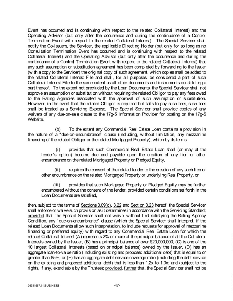 Event has occurred and is continuing with respect to the related Collateral Interest) and the Operating Advisor (but only after the occurrence and during the continuance of a Control Termination Event with respect to the related Collateral Interest). The Special Servicer shall notify the Co-Issuers, the Servicer, the applicable Directing Holder (but only for so long as no Consultation Termination Event has occurred and is continuing with respect to the related Collateral Interest) and the Operating Advisor (but only after the occurrence and during the continuance of a Control Termination Event with respect to the related Collateral Interest) that any such assumption or substitution agreement has been completed by forwarding to the Issuer (with a copy to the Servicer) the original copy of such agreement, which copies shall be added to the related Collateral Interest File and shall, for all purposes, be considered a part of such Collateral Interest File to the same extent as all other documents and instruments constituting a part thereof. To the extent not precluded by the Loan Documents, the Special Servicer shall not approve an assumption or substitution without requiring the related Obligor to pay any fees owed to the Rating Agencies associated with the approval of such assumption or substitution. However, in the event that the related Obligor is required but fails to pay such fees, such fees shall be treated as a Servicing Expense. The Special Servicer shall provide copies of any waivers of any due-on-sale clause to the 17g-5 Information Provider for posting on the 17g-5 Website. (b) To the extent any Commercial Real Estate Loan contains a provision in the nature of a “due-on-encumbrance” clause (including, without limitation, any mezzanine financing of the related Obligor or the related Mortgaged Property), which by its terms: (i) provides that such Commercial Real Estate Loan shall (or may at the lender’s option) become due and payable upon the creation of any lien or other encumbrance on the related Mortgaged Property or Pledged Equity, (ii) requires the consent of the related lender to the creation of any such lien or other encumbrance on the related Mortgaged Property or underlying Real Property, or (iii) provides that such Mortgaged Property or Pledged Equity may be further encumbered without the consent of the lender, provided certain conditions set forth in the Loan Documents are satisfied, then, subject to the terms of Sections 3.09(d), 3.22 and Section 3.23 hereof, the Special Servicer shall enforce or waive such provision as it determines in accordance with the Servicing Standard; provided that, the Special Servicer shall not waive, without first satisfying the Rating Agency Condition, any “due-on-encumbrance” clause (which the Special Servicer shall interpret, if the related Loan Documents allow such interpretation, to include requests for approval of mezzanine financing or preferred equity) with regard to any Commercial Real Estate Loan for which the related Collateral Interest (A) represents 2% or more of the principal balance of all the Collateral Interests owned by the Issuer, (B) has a principal balance of over $20,000,000, (C) is one of the 10 largest Collateral Interests (based on principal balance) owned by the Issuer, (D) has an aggregate loan-to-value ratio (including existing and proposed additional debt) that is equal to or greater than 85%, or (E) has an aggregate debt service coverage ratio (including the debt service on the existing and proposed additional debt) that is less than 1.2x to 1.0x; and (subject to the rights, if any, exercisable by the Trustee); provided, further that, the Special Servicer shall not be 24531587.11.BUSINESS -47-