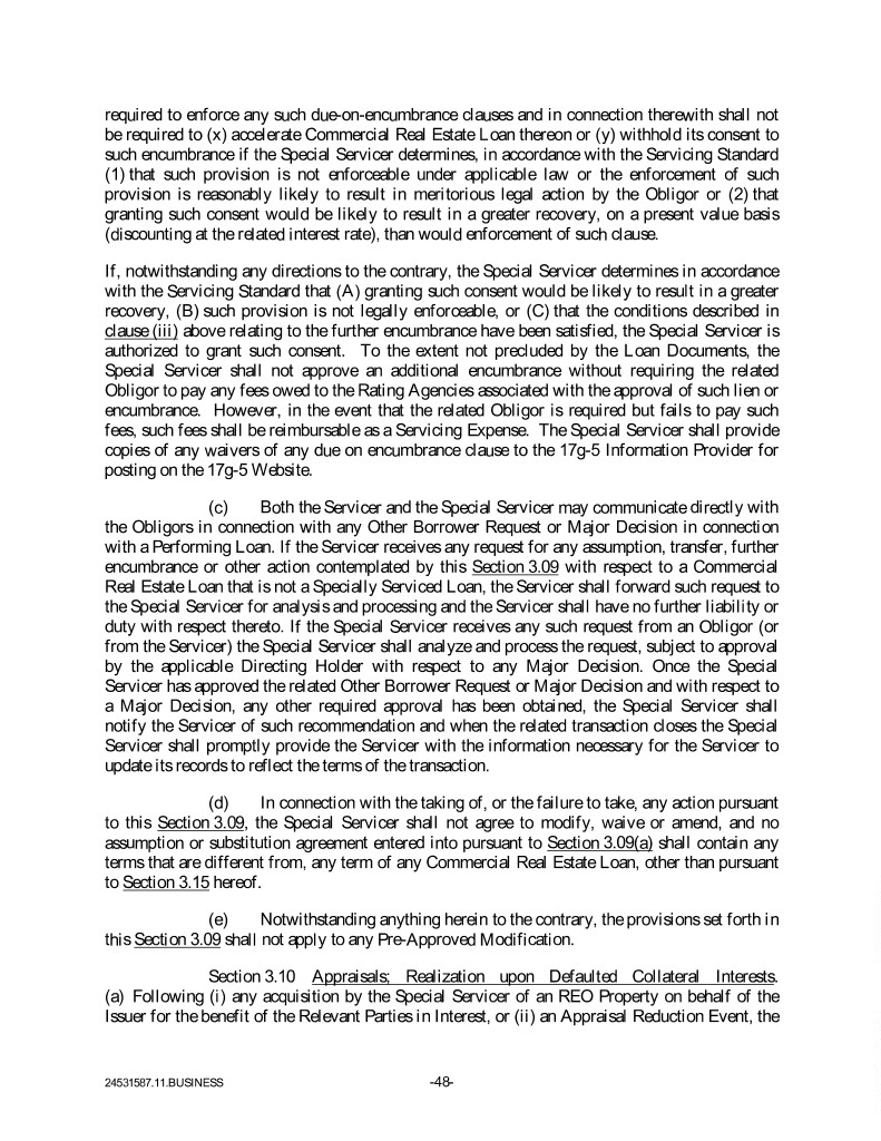 required to enforce any such due-on-encumbrance clauses and in connection therewith shall not be required to (x) accelerate Commercial Real Estate Loan thereon or (y) withhold its consent to such encumbrance if the Special Servicer determines, in accordance with the Servicing Standard (1) that such provision is not enforceable under applicable law or the enforcement of such provision is reasonably likely to result in meritorious legal action by the Obligor or (2) that granting such consent would be likely to result in a greater recovery, on a present value basis (discounting at the related interest rate), than would enforcement of such clause. If, notwithstanding any directions to the contrary, the Special Servicer determines in accordance with the Servicing Standard that (A) granting such consent would be likely to result in a greater recovery, (B) such provision is not legally enforceable, or (C) that the conditions described in clause (iii) above relating to the further encumbrance have been satisfied, the Special Servicer is authorized to grant such consent. To the extent not precluded by the Loan Documents, the Special Servicer shall not approve an additional encumbrance without requiring the related Obligor to pay any fees owed to the Rating Agencies associated with the approval of such lien or encumbrance. However, in the event that the related Obligor is required but fails to pay such fees, such fees shall be reimbursable as a Servicing Expense. The Special Servicer shall provide copies of any waivers of any due on encumbrance clause to the 17g-5 Information Provider for posting on the 17g-5 Website. (c) Both the Servicer and the Special Servicer may communicate directly with the Obligors in connection with any Other Borrower Request or Major Decision in connection with a Performing Loan. If the Servicer receives any request for any assumption, transfer, further encumbrance or other action contemplated by this Section 3.09 with respect to a Commercial Real Estate Loan that is not a Specially Serviced Loan, the Servicer shall forward such request to the Special Servicer for analysis and processing and the Servicer shall have no further liability or duty with respect thereto. If the Special Servicer receives any such request from an Obligor (or from the Servicer) the Special Servicer shall analyze and process the request, subject to approval by the applicable Directing Holder with respect to any Major Decision. Once the Special Servicer has approved the related Other Borrower Request or Major Decision and with respect to a Major Decision, any other required approval has been obtained, the Special Servicer shall notify the Servicer of such recommendation and when the related transaction closes the Special Servicer shall promptly provide the Servicer with the information necessary for the Servicer to update its records to reflect the terms of the transaction. (d) In connection with the taking of, or the failure to take, any action pursuant to this Section 3.09, the Special Servicer shall not agree to modify, waive or amend, and no assumption or substitution agreement entered into pursuant to Section 3.09(a) shall contain any terms that are different from, any term of any Commercial Real Estate Loan, other than pursuant to Section 3.15 hereof. (e) Notwithstanding anything herein to the contrary, the provisions set forth in this Section 3.09 shall not apply to any Pre-Approved Modification. Section 3.10 Appraisals; Realization upon Defaulted Collateral Interests. (a) Following (i) any acquisition by the Special Servicer of an REO Property on behalf of the Issuer for the benefit of the Relevant Parties in Interest, or (ii) an Appraisal Reduction Event, the 24531587.11.BUSINESS -48-