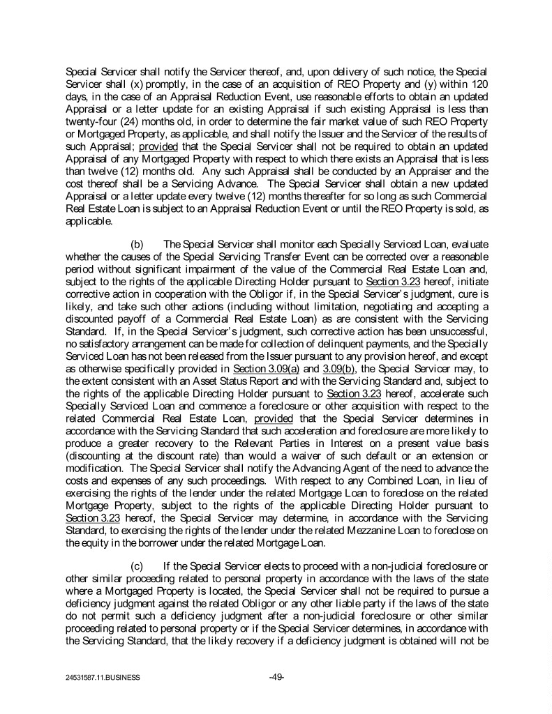 Special Servicer shall notify the Servicer thereof, and, upon delivery of such notice, the Special Servicer shall (x) promptly, in the case of an acquisition of REO Property and (y) within 120 days, in the case of an Appraisal Reduction Event, use reasonable efforts to obtain an updated Appraisal or a letter update for an existing Appraisal if such existing Appraisal is less than twenty-four (24) months old, in order to determine the fair market value of such REO Property or Mortgaged Property, as applicable, and shall notify the Issuer and the Servicer of the results of such Appraisal; provided that the Special Servicer shall not be required to obtain an updated Appraisal of any Mortgaged Property with respect to which there exists an Appraisal that is less than twelve (12) months old. Any such Appraisal shall be conducted by an Appraiser and the cost thereof shall be a Servicing Advance. The Special Servicer shall obtain a new updated Appraisal or a letter update every twelve (12) months thereafter for so long as such Commercial Real Estate Loan is subject to an Appraisal Reduction Event or until the REO Property is sold, as applicable. (b) The Special Servicer shall monitor each Specially Serviced Loan, evaluate whether the causes of the Special Servicing Transfer Event can be corrected over a reasonable period without significant impairment of the value of the Commercial Real Estate Loan and, subject to the rights of the applicable Directing Holder pursuant to Section 3.23 hereof, initiate corrective action in cooperation with the Obligor if, in the Special Servicer’s judgment, cure is likely, and take such other actions (including without limitation, negotiating and accepting a discounted payoff of a Commercial Real Estate Loan) as are consistent with the Servicing Standard. If, in the Special Servicer’s judgment, such corrective action has been unsuccessful, no satisfactory arrangement can be made for collection of delinquent payments, and the Specially Serviced Loan has not been released from the Issuer pursuant to any provision hereof, and except as otherwise specifically provided in Section 3.09(a) and 3.09(b), the Special Servicer may, to the extent consistent with an Asset Status Report and with the Servicing Standard and, subject to the rights of the applicable Directing Holder pursuant to Section 3.23 hereof, accelerate such Specially Serviced Loan and commence a foreclosure or other acquisition with respect to the related Commercial Real Estate Loan, provided that the Special Servicer determines in accordance with the Servicing Standard that such acceleration and foreclosure are more likely to produce a greater recovery to the Relevant Parties in Interest on a present value basis (discounting at the discount rate) than would a waiver of such default or an extension or modification. The Special Servicer shall notify the Advancing Agent of the need to advance the costs and expenses of any such proceedings. With respect to any Combined Loan, in lieu of exercising the rights of the lender under the related Mortgage Loan to foreclose on the related Mortgage Property, subject to the rights of the applicable Directing Holder pursuant to Section 3.23 hereof, the Special Servicer may determine, in accordance with the Servicing Standard, to exercising the rights of the lender under the related Mezzanine Loan to foreclose on the equity in the borrower under the related Mortgage Loan. (c) If the Special Servicer elects to proceed with a non-judicial foreclosure or other similar proceeding related to personal property in accordance with the laws of the state where a Mortgaged Property is located, the Special Servicer shall not be required to pursue a deficiency judgment against the related Obligor or any other liable party if the laws of the state do not permit such a deficiency judgment after a non-judicial foreclosure or other similar proceeding related to personal property or if the Special Servicer determines, in accordance with the Servicing Standard, that the likely recovery if a deficiency judgment is obtained will not be 24531587.11.BUSINESS -49-