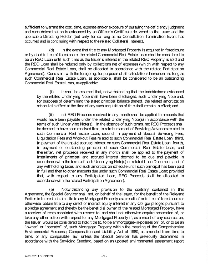 sufficient to warrant the cost, time, expense and/or exposure of pursuing the deficiency judgment and such determination is evidenced by an Officer’s Certificate delivered to the Issuer and the applicable Directing Holder (but only for so long as no Consultation Termination Event has occurred and is continuing with respect to the related Collateral Interest). (d) In the event that title to any Mortgaged Property is acquired in foreclosure or by deed in lieu of foreclosure, the related Commercial Real Estate Loan shall be considered to be an REO Loan until such time as the Issuer’s interest in the related REO Property is sold and the REO Loan shall be reduced only by collections net of expenses (which with respect to any Commercial Real Estate Loan, shall be allocated in accordance with the related Participation Agreement). Consistent with the foregoing, for purposes of all calculations hereunder, so long as such Commercial Real Estate Loan, as applicable, shall be considered to be an outstanding Commercial Real Estate Loan, as applicable: (i) it shall be assumed that, notwithstanding that the indebtedness evidenced by the related Underlying Note shall have been discharged, such Underlying Note and, for purposes of determining the stated principal balance thereof, the related amortization schedule in effect at the time of any such acquisition of title shall remain in effect; and (ii) net REO Proceeds received in any month shall be applied to amounts that would have been payable under the related Underlying Note(s) in accordance with the terms of such Underlying Note(s). In the absence of such terms, net REO Proceeds shall be deemed to have been received first, in reimbursement of Servicing Advances related to such Commercial Real Estate Loan; second, in payment of Special Servicing Fees, Liquidation Fees and Workout Fees related to such Commercial Real Estate Loan; third, in payment of the unpaid accrued interest on such Commercial Real Estate Loan; fourth, in payment of outstanding principal of such Commercial Real Estate Loan; and thereafter, net proceeds received in any month shall be applied to the payment of installments of principal and accrued interest deemed to be due and payable in accordance with the terms of such Underlying Note(s) or related Loan Documents, net of any withholding taxes, and such amortization schedule until such principal has been paid in full and then to other amounts due under such Commercial Real Estate Loan; provided that, with respect to any Participated Loan, REO Proceeds shall be allocated in accordance with the related Participation Agreement). (e) Notwithstanding any provision to the contrary contained in this Agreement, the Special Servicer shall not, on behalf of the Issuer, for the benefit of the Relevant Parties in Interest, obtain title to any Mortgaged Property as a result of or in lieu of foreclosure or otherwise, obtain title to any direct or indirect equity interest in any Obligor pledged pursuant to a pledge agreement and thereby be the beneficial owner of the related Mortgaged Property, have a receiver of rents appointed with respect to, and shall not otherwise acquire possession of, or take any other action with respect to, any Mortgaged Property if, as a result of any such action, the Issuer, would be considered to hold title to, to be a “mortgagee-in-possession” of, or to be an “owner” or “operator” of, such Mortgaged Property within the meaning of the Comprehensive Environmental Response, Compensation and Liability Act of 1980, as amended from time to time, or any comparable law, unless the Special Servicer has previously determined in accordance with the Servicing Standard, based on an updated environmental assessment report 24531587.11.BUSINESS -50-