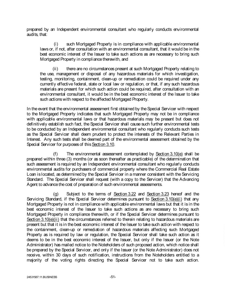 prepared by an Independent environmental consultant who regularly conducts environmental audits, that: (i) such Mortgaged Property is in compliance with applicable environmental laws or, if not, after consultation with an environmental consultant, that it would be in the best economic interest of the Issuer to take such actions as are necessary to bring such Mortgaged Property in compliance therewith, and (ii) there are no circumstances present at such Mortgaged Property relating to the use, management or disposal of any hazardous materials for which investigation, testing, monitoring, containment, clean-up or remediation could be required under any currently effective federal, state or local law or regulation, or that, if any such hazardous materials are present for which such action could be required, after consultation with an environmental consultant, it would be in the best economic interest of the Issuer to take such actions with respect to the affected Mortgaged Property. In the event that the environmental assessment first obtained by the Special Servicer with respect to the Mortgaged Property indicates that such Mortgaged Property may not be in compliance with applicable environmental laws or that hazardous materials may be present but does not definitively establish such fact, the Special Servicer shall cause such further environmental tests to be conducted by an Independent environmental consultant who regularly conducts such tests as the Special Servicer shall deem prudent to protect the interests of the Relevant Parties in Interest. Any such tests shall be deemed part of the environmental assessment obtained by the Special Servicer for purposes of this Section 3.10. (f) The environmental assessment contemplated by Section 3.10(e) shall be prepared within three (3) months (or as soon thereafter as practicable) of the determination that such assessment is required by an Independent environmental consultant who regularly conducts environmental audits for purchasers of commercial property where the Commercial Real Estate Loan is located, as determined by the Special Servicer in a manner consistent with the Servicing Standard. The Special Servicer shall request (with a copy to the Servicer) that the Advancing Agent to advance the cost of preparation of such environmental assessments. (g) Subject to the terms of Section 3.22 and Section 3.23 hereof and the Servicing Standard, if the Special Servicer determines pursuant to Section 3.10(e)(i) that any Mortgaged Property is not in compliance with applicable environmental laws but that it is in the best economic interest of the Issuer to take such actions as are necessary to bring such Mortgaged Property in compliance therewith, or if the Special Servicer determines pursuant to Section 3.10(e)(ii) that the circumstances referred to therein relating to hazardous materials are present but that it is in the best economic interest of the Issuer to take such action with respect to the containment, clean-up or remediation of hazardous materials affecting such Mortgaged Property as is required by law or regulation, the Special Servicer shall take such action as it deems to be in the best economic interest of the Issuer, but only if the Issuer (or the Note Administrator) has mailed notice to the Noteholders of such proposed action, which notice shall be prepared by the Special Servicer, and only if the Issuer (or the Note Administrator) does not receive, within 30 days of such notification, instructions from the Noteholders entitled to a majority of the voting rights directing the Special Servicer not to take such action. 24531587.11.BUSINESS -51-