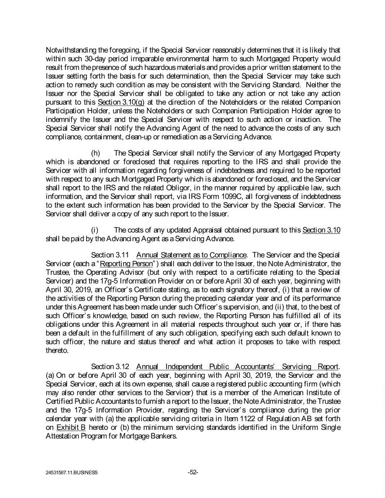 Notwithstanding the foregoing, if the Special Servicer reasonably determines that it is likely that within such 30-day period irreparable environmental harm to such Mortgaged Property would result from the presence of such hazardous materials and provides a prior written statement to the Issuer setting forth the basis for such determination, then the Special Servicer may take such action to remedy such condition as may be consistent with the Servicing Standard. Neither the Issuer nor the Special Servicer shall be obligated to take any action or not take any action pursuant to this Section 3.10(g) at the direction of the Noteholders or the related Companion Participation Holder, unless the Noteholders or such Companion Participation Holder agree to indemnify the Issuer and the Special Servicer with respect to such action or inaction. The Special Servicer shall notify the Advancing Agent of the need to advance the costs of any such compliance, containment, clean-up or remediation as a Servicing Advance. (h) The Special Servicer shall notify the Servicer of any Mortgaged Property which is abandoned or foreclosed that requires reporting to the IRS and shall provide the Servicer with all information regarding forgiveness of indebtedness and required to be reported with respect to any such Mortgaged Property which is abandoned or foreclosed, and the Servicer shall report to the IRS and the related Obligor, in the manner required by applicable law, such information, and the Servicer shall report, via IRS Form 1099C, all forgiveness of indebtedness to the extent such information has been provided to the Servicer by the Special Servicer. The Servicer shall deliver a copy of any such report to the Issuer. (i) The costs of any updated Appraisal obtained pursuant to this Section 3.10 shall be paid by the Advancing Agent as a Servicing Advance. Section 3.11 Annual Statement as to Compliance. The Servicer and the Special Servicer (each a “Reporting Person”) shall each deliver to the Issuer, the Note Administrator, the Trustee, the Operating Advisor (but only with respect to a certificate relating to the Special Servicer) and the 17g-5 Information Provider on or before April 30 of each year, beginning with April 30, 2019, an Officer’s Certificate stating, as to each signatory thereof, (i) that a review of the activities of the Reporting Person during the preceding calendar year and of its performance under this Agreement has been made under such Officer’s supervision, and (ii) that, to the best of such Officer’s knowledge, based on such review, the Reporting Person has fulfilled all of its obligations under this Agreement in all material respects throughout such year or, if there has been a default in the fulfillment of any such obligation, specifying each such default known to such officer, the nature and status thereof and what action it proposes to take with respect thereto. Section 3.12 Annual Independent Public Accountants’ Servicing Report. (a) On or before April 30 of each year, beginning with April 30, 2019, the Servicer and the Special Servicer, each at its own expense, shall cause a registered public accounting firm (which may also render other services to the Servicer) that is a member of the American Institute of Certified Public Accountants to furnish a report to the Issuer, the Note Administrator, the Trustee and the 17g-5 Information Provider, regarding the Servicer’s compliance during the prior calendar year with (a) the applicable servicing criteria in Item 1122 of Regulation AB set forth on Exhibit B hereto or (b) the minimum servicing standards identified in the Uniform Single Attestation Program for Mortgage Bankers. 24531587.11.BUSINESS -52-