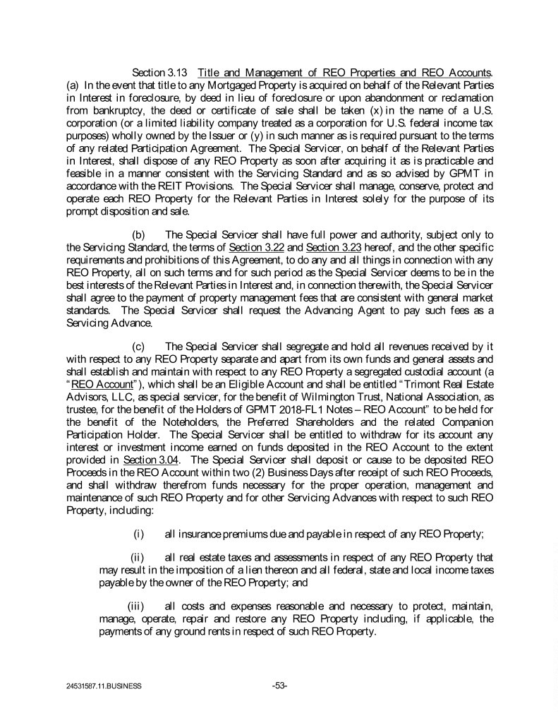 Section 3.13 Title and Management of REO Properties and REO Accounts. (a) In the event that title to any Mortgaged Property is acquired on behalf of the Relevant Parties in Interest in foreclosure, by deed in lieu of foreclosure or upon abandonment or reclamation from bankruptcy, the deed or certificate of sale shall be taken (x) in the name of a U.S. corporation (or a limited liability company treated as a corporation for U.S. federal income tax purposes) wholly owned by the Issuer or (y) in such manner as is required pursuant to the terms of any related Participation Agreement. The Special Servicer, on behalf of the Relevant Parties in Interest, shall dispose of any REO Property as soon after acquiring it as is practicable and feasible in a manner consistent with the Servicing Standard and as so advised by GPMT in accordance with the REIT Provisions. The Special Servicer shall manage, conserve, protect and operate each REO Property for the Relevant Parties in Interest solely for the purpose of its prompt disposition and sale. (b) The Special Servicer shall have full power and authority, subject only to the Servicing Standard, the terms of Section 3.22 and Section 3.23 hereof, and the other specific requirements and prohibitions of this Agreement, to do any and all things in connection with any REO Property, all on such terms and for such period as the Special Servicer deems to be in the best interests of the Relevant Parties in Interest and, in connection therewith, the Special Servicer shall agree to the payment of property management fees that are consistent with general market standards. The Special Servicer shall request the Advancing Agent to pay such fees as a Servicing Advance. (c) The Special Servicer shall segregate and hold all revenues received by it with respect to any REO Property separate and apart from its own funds and general assets and shall establish and maintain with respect to any REO Property a segregated custodial account (a “REO Account”), which shall be an Eligible Account and shall be entitled “Trimont Real Estate Advisors, LLC, as special servicer, for the benefit of Wilmington Trust, National Association, as trustee, for the benefit of the Holders of GPMT 2018-FL1 Notes – REO Account” to be held for the benefit of the Noteholders, the Preferred Shareholders and the related Companion Participation Holder. The Special Servicer shall be entitled to withdraw for its account any interest or investment income earned on funds deposited in the REO Account to the extent provided in Section 3.04. The Special Servicer shall deposit or cause to be deposited REO Proceeds in the REO Account within two (2) Business Days after receipt of such REO Proceeds, and shall withdraw therefrom funds necessary for the proper operation, management and maintenance of such REO Property and for other Servicing Advances with respect to such REO Property, including: (i) all insurance premiums due and payable in respect of any REO Property; (ii) all real estate taxes and assessments in respect of any REO Property that may result in the imposition of a lien thereon and all federal, state and local income taxes payable by the owner of the REO Property; and (iii) all costs and expenses reasonable and necessary to protect, maintain, manage, operate, repair and restore any REO Property including, if applicable, the payments of any ground rents in respect of such REO Property. 24531587.11.BUSINESS -53-