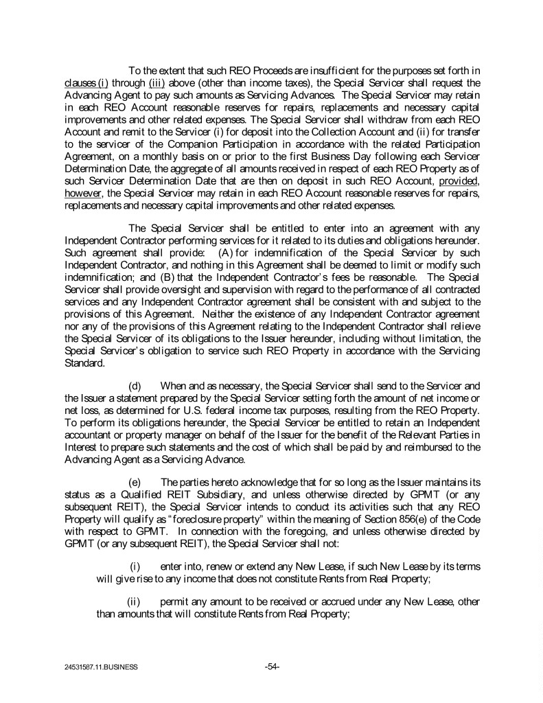 To the extent that such REO Proceeds are insufficient for the purposes set forth in clauses (i) through (iii) above (other than income taxes), the Special Servicer shall request the Advancing Agent to pay such amounts as Servicing Advances. The Special Servicer may retain in each REO Account reasonable reserves for repairs, replacements and necessary capital improvements and other related expenses. The Special Servicer shall withdraw from each REO Account and remit to the Servicer (i) for deposit into the Collection Account and (ii) for transfer to the servicer of the Companion Participation in accordance with the related Participation Agreement, on a monthly basis on or prior to the first Business Day following each Servicer Determination Date, the aggregate of all amounts received in respect of each REO Property as of such Servicer Determination Date that are then on deposit in such REO Account, provided, however, the Special Servicer may retain in each REO Account reasonable reserves for repairs, replacements and necessary capital improvements and other related expenses. The Special Servicer shall be entitled to enter into an agreement with any Independent Contractor performing services for it related to its duties and obligations hereunder. Such agreement shall provide: (A) for indemnification of the Special Servicer by such Independent Contractor, and nothing in this Agreement shall be deemed to limit or modify such indemnification; and (B) that the Independent Contractor’s fees be reasonable. The Special Servicer shall provide oversight and supervision with regard to the performance of all contracted services and any Independent Contractor agreement shall be consistent with and subject to the provisions of this Agreement. Neither the existence of any Independent Contractor agreement nor any of the provisions of this Agreement relating to the Independent Contractor shall relieve the Special Servicer of its obligations to the Issuer hereunder, including without limitation, the Special Servicer’s obligation to service such REO Property in accordance with the Servicing Standard. (d) When and as necessary, the Special Servicer shall send to the Servicer and the Issuer a statement prepared by the Special Servicer setting forth the amount of net income or net loss, as determined for U.S. federal income tax purposes, resulting from the REO Property. To perform its obligations hereunder, the Special Servicer be entitled to retain an Independent accountant or property manager on behalf of the Issuer for the benefit of the Relevant Parties in Interest to prepare such statements and the cost of which shall be paid by and reimbursed to the Advancing Agent as a Servicing Advance. (e) The parties hereto acknowledge that for so long as the Issuer maintains its status as a Qualified REIT Subsidiary, and unless otherwise directed by GPMT (or any subsequent REIT), the Special Servicer intends to conduct its activities such that any REO Property will qualify as “foreclosure property” within the meaning of Section 856(e) of the Code with respect to GPMT. In connection with the foregoing, and unless otherwise directed by GPMT (or any subsequent REIT), the Special Servicer shall not: (i) enter into, renew or extend any New Lease, if such New Lease by its terms will give rise to any income that does not constitute Rents from Real Property; (ii) permit any amount to be received or accrued under any New Lease, other than amounts that will constitute Rents from Real Property; 24531587.11.BUSINESS -54-