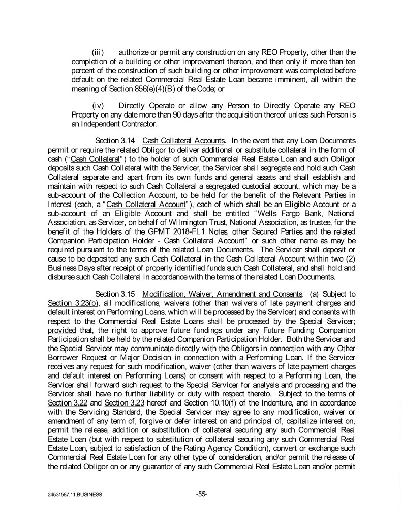 (iii) authorize or permit any construction on any REO Property, other than the completion of a building or other improvement thereon, and then only if more than ten percent of the construction of such building or other improvement was completed before default on the related Commercial Real Estate Loan became imminent, all within the meaning of Section 856(e)(4)(B) of the Code; or (iv) Directly Operate or allow any Person to Directly Operate any REO Property on any date more than 90 days after the acquisition thereof unless such Person is an Independent Contractor. Section 3.14 Cash Collateral Accounts. In the event that any Loan Documents permit or require the related Obligor to deliver additional or substitute collateral in the form of cash (“Cash Collateral”) to the holder of such Commercial Real Estate Loan and such Obligor deposits such Cash Collateral with the Servicer, the Servicer shall segregate and hold such Cash Collateral separate and apart from its own funds and general assets and shall establish and maintain with respect to such Cash Collateral a segregated custodial account, which may be a sub-account of the Collection Account, to be held for the benefit of the Relevant Parties in Interest (each, a “Cash Collateral Account”), each of which shall be an Eligible Account or a sub-account of an Eligible Account and shall be entitled “Wells Fargo Bank, National Association, as Servicer, on behalf of Wilmington Trust, National Association, as trustee, for the benefit of the Holders of the GPMT 2018-FL1 Notes, other Secured Parties and the related Companion Participation Holder - Cash Collateral Account” or such other name as may be required pursuant to the terms of the related Loan Documents. The Servicer shall deposit or cause to be deposited any such Cash Collateral in the Cash Collateral Account within two (2) Business Days after receipt of properly identified funds such Cash Collateral, and shall hold and disburse such Cash Collateral in accordance with the terms of the related Loan Documents. Section 3.15 Modification, Waiver, Amendment and Consents. (a) Subject to Section 3.23(b), all modifications, waivers (other than waivers of late payment charges and default interest on Performing Loans, which will be processed by the Servicer) and consents with respect to the Commercial Real Estate Loans shall be processed by the Special Servicer; provided that, the right to approve future fundings under any Future Funding Companion Participation shall be held by the related Companion Participation Holder. Both the Servicer and the Special Servicer may communicate directly with the Obligors in connection with any Other Borrower Request or Major Decision in connection with a Performing Loan. If the Servicer receives any request for such modification, waiver (other than waivers of late payment charges and default interest on Performing Loans) or consent with respect to a Performing Loan, the Servicer shall forward such request to the Special Servicer for analysis and processing and the Servicer shall have no further liability or duty with respect thereto. Subject to the terms of Section 3.22 and Section 3.23 hereof and Section 10.10(f) of the Indenture, and in accordance with the Servicing Standard, the Special Servicer may agree to any modification, waiver or amendment of any term of, forgive or defer interest on and principal of, capitalize interest on, permit the release, addition or substitution of collateral securing any such Commercial Real Estate Loan (but with respect to substitution of collateral securing any such Commercial Real Estate Loan, subject to satisfaction of the Rating Agency Condition), convert or exchange such Commercial Real Estate Loan for any other type of consideration, and/or permit the release of the related Obligor on or any guarantor of any such Commercial Real Estate Loan and/or permit 24531587.11.BUSINESS -55-