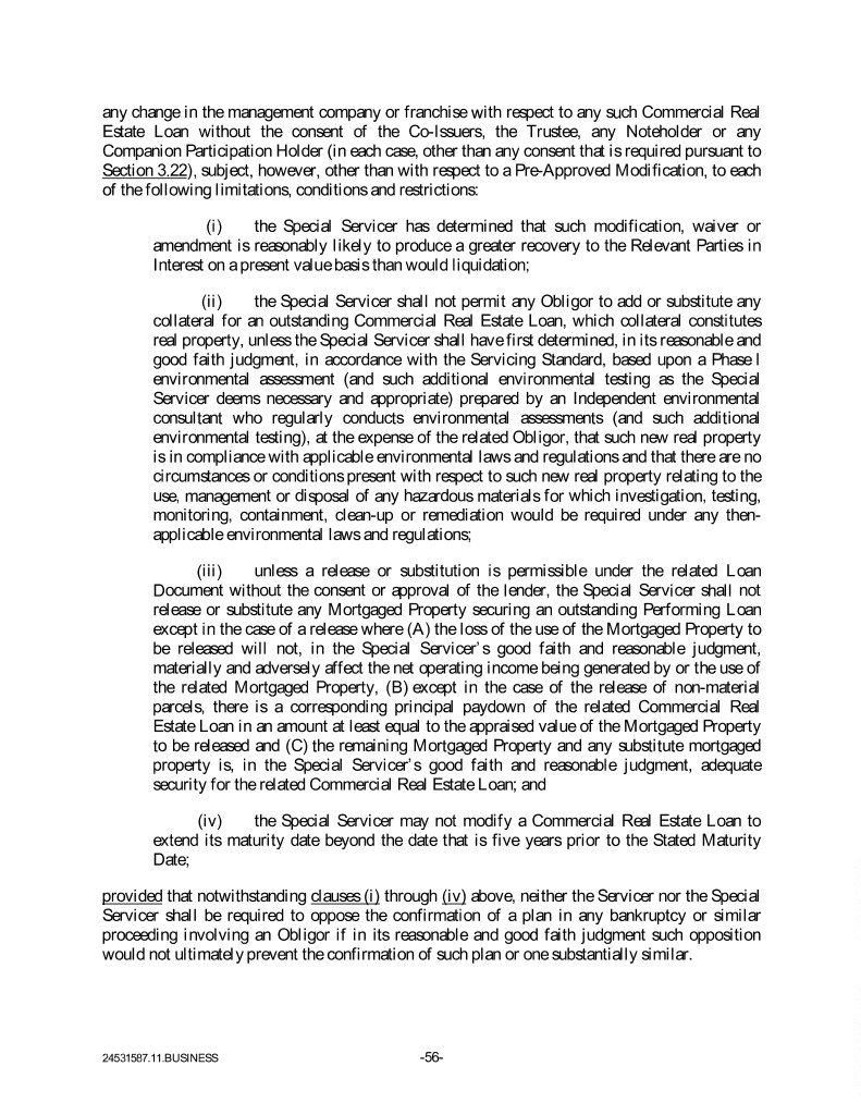 any change in the management company or franchise with respect to any such Commercial Real Estate Loan without the consent of the Co-Issuers, the Trustee, any Noteholder or any Companion Participation Holder (in each case, other than any consent that is required pursuant to Section 3.22), subject, however, other than with respect to a Pre-Approved Modification, to each of the following limitations, conditions and restrictions: (i) the Special Servicer has determined that such modification, waiver or amendment is reasonably likely to produce a greater recovery to the Relevant Parties in Interest on a present value basis than would liquidation; (ii) the Special Servicer shall not permit any Obligor to add or substitute any collateral for an outstanding Commercial Real Estate Loan, which collateral constitutes real property, unless the Special Servicer shall have first determined, in its reasonable and good faith judgment, in accordance with the Servicing Standard, based upon a Phase I environmental assessment (and such additional environmental testing as the Special Servicer deems necessary and appropriate) prepared by an Independent environmental consultant who regularly conducts environmental assessments (and such additional environmental testing), at the expense of the related Obligor, that such new real property is in compliance with applicable environmental laws and regulations and that there are no circumstances or conditions present with respect to such new real property relating to the use, management or disposal of any hazardous materials for which investigation, testing, monitoring, containment, clean-up or remediation would be required under any then- applicable environmental laws and regulations; (iii) unless a release or substitution is permissible under the related Loan Document without the consent or approval of the lender, the Special Servicer shall not release or substitute any Mortgaged Property securing an outstanding Performing Loan except in the case of a release where (A) the loss of the use of the Mortgaged Property to be released will not, in the Special Servicer’s good faith and reasonable judgment, materially and adversely affect the net operating income being generated by or the use of the related Mortgaged Property, (B) except in the case of the release of non-material parcels, there is a corresponding principal paydown of the related Commercial Real Estate Loan in an amount at least equal to the appraised value of the Mortgaged Property to be released and (C) the remaining Mortgaged Property and any substitute mortgaged property is, in the Special Servicer’s good faith and reasonable judgment, adequate security for the related Commercial Real Estate Loan; and (iv) the Special Servicer may not modify a Commercial Real Estate Loan to extend its maturity date beyond the date that is five years prior to the Stated Maturity Date; provided that notwithstanding clauses (i) through (iv) above, neither the Servicer nor the Special Servicer shall be required to oppose the confirmation of a plan in any bankruptcy or similar proceeding involving an Obligor if in its reasonable and good faith judgment such opposition would not ultimately prevent the confirmation of such plan or one substantially similar. 24531587.11.BUSINESS -56-