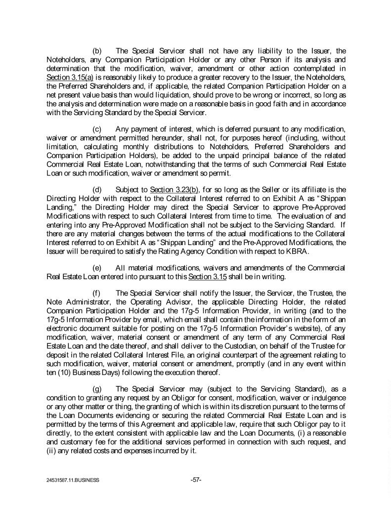 (b) The Special Servicer shall not have any liability to the Issuer, the Noteholders, any Companion Participation Holder or any other Person if its analysis and determination that the modification, waiver, amendment or other action contemplated in Section 3.15(a) is reasonably likely to produce a greater recovery to the Issuer, the Noteholders, the Preferred Shareholders and, if applicable, the related Companion Participation Holder on a net present value basis than would liquidation, should prove to be wrong or incorrect, so long as the analysis and determination were made on a reasonable basis in good faith and in accordance with the Servicing Standard by the Special Servicer. (c) Any payment of interest, which is deferred pursuant to any modification, waiver or amendment permitted hereunder, shall not, for purposes hereof (including, without limitation, calculating monthly distributions to Noteholders, Preferred Shareholders and Companion Participation Holders), be added to the unpaid principal balance of the related Commercial Real Estate Loan, notwithstanding that the terms of such Commercial Real Estate Loan or such modification, waiver or amendment so permit. (d) Subject to Section 3.23(b), for so long as the Seller or its affiliate is the Directing Holder with respect to the Collateral Interest referred to on Exhibit A as “Shippan Landing,” the Directing Holder may direct the Special Servicer to approve Pre-Approved Modifications with respect to such Collateral Interest from time to time. The evaluation of and entering into any Pre-Approved Modification shall not be subject to the Servicing Standard. If there are any material changes between the terms of the actual modifications to the Collateral Interest referred to on Exhibit A as “Shippan Landing” and the Pre-Approved Modifications, the Issuer will be required to satisfy the Rating Agency Condition with respect to KBRA. (e) All material modifications, waivers and amendments of the Commercial Real Estate Loan entered into pursuant to this Section 3.15 shall be in writing. (f) The Special Servicer shall notify the Issuer, the Servicer, the Trustee, the Note Administrator, the Operating Advisor, the applicable Directing Holder, the related Companion Participation Holder and the 17g-5 Information Provider, in writing (and to the 17g-5 Information Provider by email, which email shall contain the information in the form of an electronic document suitable for posting on the 17g-5 Information Provider’s website), of any modification, waiver, material consent or amendment of any term of any Commercial Real Estate Loan and the date thereof, and shall deliver to the Custodian, on behalf of the Trustee for deposit in the related Collateral Interest File, an original counterpart of the agreement relating to such modification, waiver, material consent or amendment, promptly (and in any event within ten (10) Business Days) following the execution thereof. (g) The Special Servicer may (subject to the Servicing Standard), as a condition to granting any request by an Obligor for consent, modification, waiver or indulgence or any other matter or thing, the granting of which is within its discretion pursuant to the terms of the Loan Documents evidencing or securing the related Commercial Real Estate Loan and is permitted by the terms of this Agreement and applicable law, require that such Obligor pay to it directly, to the extent consistent with applicable law and the Loan Documents, (i) a reasonable and customary fee for the additional services performed in connection with such request, and (ii) any related costs and expenses incurred by it. 24531587.11.BUSINESS -57-