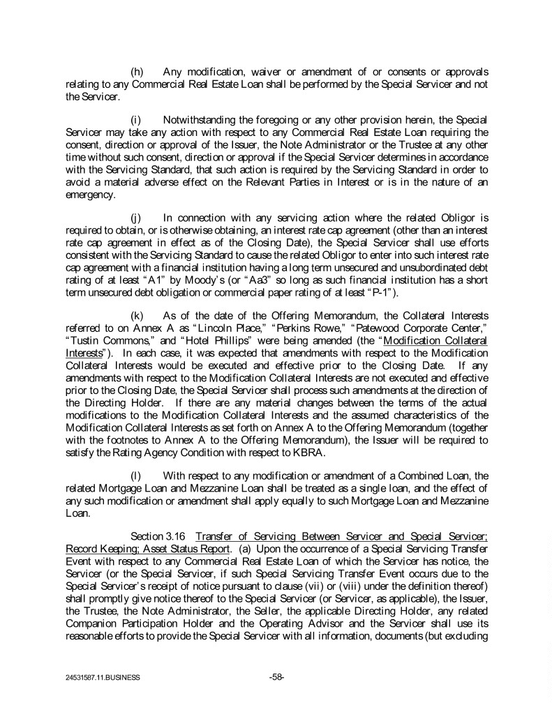 (h) Any modification, waiver or amendment of or consents or approvals relating to any Commercial Real Estate Loan shall be performed by the Special Servicer and not the Servicer. (i) Notwithstanding the foregoing or any other provision herein, the Special Servicer may take any action with respect to any Commercial Real Estate Loan requiring the consent, direction or approval of the Issuer, the Note Administrator or the Trustee at any other time without such consent, direction or approval if the Special Servicer determines in accordance with the Servicing Standard, that such action is required by the Servicing Standard in order to avoid a material adverse effect on the Relevant Parties in Interest or is in the nature of an emergency. (j) In connection with any servicing action where the related Obligor is required to obtain, or is otherwise obtaining, an interest rate cap agreement (other than an interest rate cap agreement in effect as of the Closing Date), the Special Servicer shall use efforts consistent with the Servicing Standard to cause the related Obligor to enter into such interest rate cap agreement with a financial institution having a long term unsecured and unsubordinated debt rating of at least “A1” by Moody’s (or “Aa3” so long as such financial institution has a short term unsecured debt obligation or commercial paper rating of at least “P-1”). (k) As of the date of the Offering Memorandum, the Collateral Interests referred to on Annex A as “Lincoln Place,” “Perkins Rowe,” “Patewood Corporate Center,” “Tustin Commons,” and “Hotel Phillips” were being amended (the “Modification Collateral Interests”). In each case, it was expected that amendments with respect to the Modification Collateral Interests would be executed and effective prior to the Closing Date. If any amendments with respect to the Modification Collateral Interests are not executed and effective prior to the Closing Date, the Special Servicer shall process such amendments at the direction of the Directing Holder. If there are any material changes between the terms of the actual modifications to the Modification Collateral Interests and the assumed characteristics of the Modification Collateral Interests as set forth on Annex A to the Offering Memorandum (together with the footnotes to Annex A to the Offering Memorandum), the Issuer will be required to satisfy the Rating Agency Condition with respect to KBRA. (l) With respect to any modification or amendment of a Combined Loan, the related Mortgage Loan and Mezzanine Loan shall be treated as a single loan, and the effect of any such modification or amendment shall apply equally to such Mortgage Loan and Mezzanine Loan. Section 3.16 Transfer of Servicing Between Servicer and Special Servicer; Record Keeping; Asset Status Report. (a) Upon the occurrence of a Special Servicing Transfer Event with respect to any Commercial Real Estate Loan of which the Servicer has notice, the Servicer (or the Special Servicer, if such Special Servicing Transfer Event occurs due to the Special Servicer’s receipt of notice pursuant to clause (vii) or (viii) under the definition thereof) shall promptly give notice thereof to the Special Servicer (or Servicer, as applicable), the Issuer, the Trustee, the Note Administrator, the Seller, the applicable Directing Holder, any related Companion Participation Holder and the Operating Advisor and the Servicer shall use its reasonable efforts to provide the Special Servicer with all information, documents (but excluding 24531587.11.BUSINESS -58-