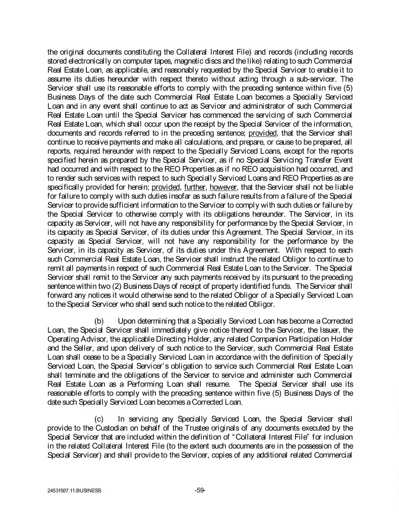 the original documents constituting the Collateral Interest File) and records (including records stored electronically on computer tapes, magnetic discs and the like) relating to such Commercial Real Estate Loan, as applicable, and reasonably requested by the Special Servicer to enable it to assume its duties hereunder with respect thereto without acting through a sub-servicer. The Servicer shall use its reasonable efforts to comply with the preceding sentence within five (5) Business Days of the date such Commercial Real Estate Loan becomes a Specially Serviced Loan and in any event shall continue to act as Servicer and administrator of such Commercial Real Estate Loan until the Special Servicer has commenced the servicing of such Commercial Real Estate Loan, which shall occur upon the receipt by the Special Servicer of the information, documents and records referred to in the preceding sentence; provided, that the Servicer shall continue to receive payments and make all calculations, and prepare, or cause to be prepared, all reports, required hereunder with respect to the Specially Serviced Loans, except for the reports specified herein as prepared by the Special Servicer, as if no Special Servicing Transfer Event had occurred and with respect to the REO Properties as if no REO acquisition had occurred, and to render such services with respect to such Specially Serviced Loans and REO Properties as are specifically provided for herein; provided, further, however, that the Servicer shall not be liable for failure to comply with such duties insofar as such failure results from a failure of the Special Servicer to provide sufficient information to the Servicer to comply with such duties or failure by the Special Servicer to otherwise comply with its obligations hereunder. The Servicer, in its capacity as Servicer, will not have any responsibility for performance by the Special Servicer, in its capacity as Special Servicer, of its duties under this Agreement. The Special Servicer, in its capacity as Special Servicer, will not have any responsibility for the performance by the Servicer, in its capacity as Servicer, of its duties under this Agreement. With respect to each such Commercial Real Estate Loan, the Servicer shall instruct the related Obligor to continue to remit all payments in respect of such Commercial Real Estate Loan to the Servicer. The Special Servicer shall remit to the Servicer any such payments received by its pursuant to the preceding sentence within two (2) Business Days of receipt of property identified funds. The Servicer shall forward any notices it would otherwise send to the related Obligor of a Specially Serviced Loan to the Special Servicer who shall send such notice to the related Obligor. (b) Upon determining that a Specially Serviced Loan has become a Corrected Loan, the Special Servicer shall immediately give notice thereof to the Servicer, the Issuer, the Operating Advisor, the applicable Directing Holder, any related Companion Participation Holder and the Seller, and upon delivery of such notice to the Servicer, such Commercial Real Estate Loan shall cease to be a Specially Serviced Loan in accordance with the definition of Specially Serviced Loan, the Special Servicer’s obligation to service such Commercial Real Estate Loan shall terminate and the obligations of the Servicer to service and administer such Commercial Real Estate Loan as a Performing Loan shall resume. The Special Servicer shall use its reasonable efforts to comply with the preceding sentence within five (5) Business Days of the date such Specially Serviced Loan becomes a Corrected Loan. (c) In servicing any Specially Serviced Loan, the Special Servicer shall provide to the Custodian on behalf of the Trustee originals of any documents executed by the Special Servicer that are included within the definition of “Collateral Interest File” for inclusion in the related Collateral Interest File (to the extent such documents are in the possession of the Special Servicer) and shall provide to the Servicer, copies of any additional related Commercial 24531587.11.BUSINESS -59-
