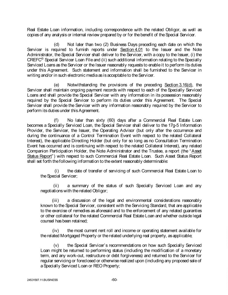 Real Estate Loan information, including correspondence with the related Obligor, as well as copies of any analysis or internal review prepared by or for the benefit of the Special Servicer. (d) Not later than two (2) Business Days preceding each date on which the Servicer is required to furnish reports under Section 4.01 to the Issuer and the Note Administrator, the Special Servicer shall deliver to the Servicer, with a copy to the Issuer, (i) the CREFC® Special Servicer Loan File and (ii) such additional information relating to the Specially Serviced Loans as the Servicer or the Issuer reasonably requests to enable it to perform its duties under this Agreement. Such statement and information shall be furnished to the Servicer in writing and/or in such electronic media as is acceptable to the Servicer. (e) Notwithstanding the provisions of the preceding Section 3.16(d), the Servicer shall maintain ongoing payment records with respect to each of the Specially Serviced Loans and shall provide the Special Servicer with any information in its possession reasonably required by the Special Servicer to perform its duties under this Agreement. The Special Servicer shall provide the Servicer with any information reasonably required by the Servicer to perform its duties under this Agreement. (f) No later than sixty (60) days after a Commercial Real Estate Loan becomes a Specially Serviced Loan, the Special Servicer shall deliver to the 17g-5 Information Provider, the Servicer, the Issuer, the Operating Advisor (but only after the occurrence and during the continuance of a Control Termination Event with respect to the related Collateral Interest), the applicable Directing Holder (but only for so long as no Consultation Termination Event has occurred and is continuing with respect to the related Collateral Interest), any related Companion Participation Holder, the Note Administrator and the Trustee, a report (the “Asset Status Report”) with respect to such Commercial Real Estate Loan. Such Asset Status Report shall set forth the following information to the extent reasonably determinable: (i) the date of transfer of servicing of such Commercial Real Estate Loan to the Special Servicer; (ii) a summary of the status of such Specially Serviced Loan and any negotiations with the related Obligor; (iii) a discussion of the legal and environmental considerations reasonably known to the Special Servicer, consistent with the Servicing Standard, that are applicable to the exercise of remedies as aforesaid and to the enforcement of any related guaranties or other collateral for the related Commercial Real Estate Loan and whether outside legal counsel has been retained; (iv) the most current rent roll and income or operating statement available for the related Mortgaged Property or the related underlying real property, as applicable; (v) the Special Servicer’s recommendations on how such Specially Serviced Loan might be returned to performing status (including the modification of a monetary term, and any work-out, restructure or debt forgiveness) and returned to the Servicer for regular servicing or foreclosed or otherwise realized upon (including any proposed sale of a Specially Serviced Loan or REO Property; 24531587.11.BUSINESS -60-
