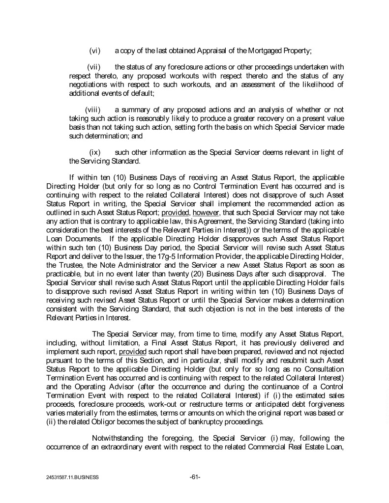(vi) a copy of the last obtained Appraisal of the Mortgaged Property; (vii) the status of any foreclosure actions or other proceedings undertaken with respect thereto, any proposed workouts with respect thereto and the status of any negotiations with respect to such workouts, and an assessment of the likelihood of additional events of default; (viii) a summary of any proposed actions and an analysis of whether or not taking such action is reasonably likely to produce a greater recovery on a present value basis than not taking such action, setting forth the basis on which Special Servicer made such determination; and (ix) such other information as the Special Servicer deems relevant in light of the Servicing Standard. If within ten (10) Business Days of receiving an Asset Status Report, the applicable Directing Holder (but only for so long as no Control Termination Event has occurred and is continuing with respect to the related Collateral Interest) does not disapprove of such Asset Status Report in writing, the Special Servicer shall implement the recommended action as outlined in such Asset Status Report; provided, however, that such Special Servicer may not take any action that is contrary to applicable law, this Agreement, the Servicing Standard (taking into consideration the best interests of the Relevant Parties in Interest)) or the terms of the applicable Loan Documents. If the applicable Directing Holder disapproves such Asset Status Report within such ten (10) Business Day period, the Special Servicer will revise such Asset Status Report and deliver to the Issuer, the 17g-5 Information Provider, the applicable Directing Holder, the Trustee, the Note Administrator and the Servicer a new Asset Status Report as soon as practicable, but in no event later than twenty (20) Business Days after such disapproval. The Special Servicer shall revise such Asset Status Report until the applicable Directing Holder fails to disapprove such revised Asset Status Report in writing within ten (10) Business Days of receiving such revised Asset Status Report or until the Special Servicer makes a determination consistent with the Servicing Standard, that such objection is not in the best interests of the Relevant Parties in Interest. The Special Servicer may, from time to time, modify any Asset Status Report, including, without limitation, a Final Asset Status Report, it has previously delivered and implement such report, provided such report shall have been prepared, reviewed and not rejected pursuant to the terms of this Section, and in particular, shall modify and resubmit such Asset Status Report to the applicable Directing Holder (but only for so long as no Consultation Termination Event has occurred and is continuing with respect to the related Collateral Interest) and the Operating Advisor (after the occurrence and during the continuance of a Control Termination Event with respect to the related Collateral Interest) if (i) the estimated sales proceeds, foreclosure proceeds, work-out or restructure terms or anticipated debt forgiveness varies materially from the estimates, terms or amounts on which the original report was based or (ii) the related Obligor becomes the subject of bankruptcy proceedings. Notwithstanding the foregoing, the Special Servicer (i) may, following the occurrence of an extraordinary event with respect to the related Commercial Real Estate Loan, 24531587.11.BUSINESS -61-