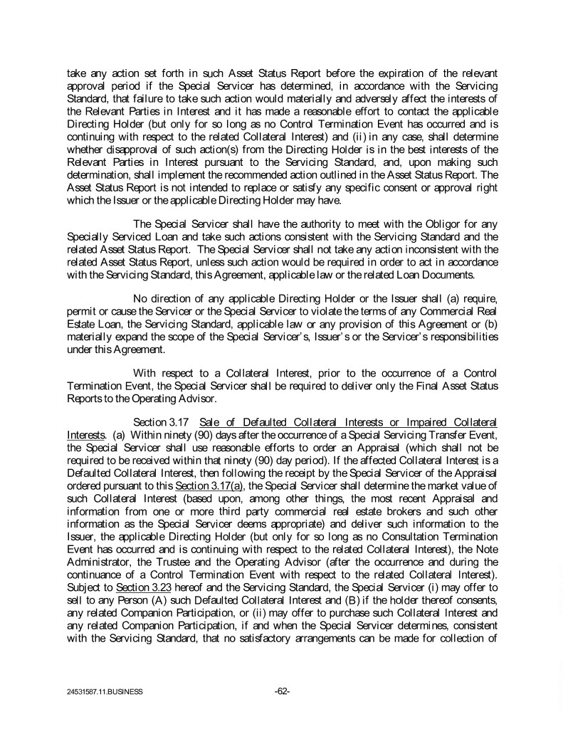 take any action set forth in such Asset Status Report before the expiration of the relevant approval period if the Special Servicer has determined, in accordance with the Servicing Standard, that failure to take such action would materially and adversely affect the interests of the Relevant Parties in Interest and it has made a reasonable effort to contact the applicable Directing Holder (but only for so long as no Control Termination Event has occurred and is continuing with respect to the related Collateral Interest) and (ii) in any case, shall determine whether disapproval of such action(s) from the Directing Holder is in the best interests of the Relevant Parties in Interest pursuant to the Servicing Standard, and, upon making such determination, shall implement the recommended action outlined in the Asset Status Report. The Asset Status Report is not intended to replace or satisfy any specific consent or approval right which the Issuer or the applicable Directing Holder may have. The Special Servicer shall have the authority to meet with the Obligor for any Specially Serviced Loan and take such actions consistent with the Servicing Standard and the related Asset Status Report. The Special Servicer shall not take any action inconsistent with the related Asset Status Report, unless such action would be required in order to act in accordance with the Servicing Standard, this Agreement, applicable law or the related Loan Documents. No direction of any applicable Directing Holder or the Issuer shall (a) require, permit or cause the Servicer or the Special Servicer to violate the terms of any Commercial Real Estate Loan, the Servicing Standard, applicable law or any provision of this Agreement or (b) materially expand the scope of the Special Servicer’s, Issuer’s or the Servicer’s responsibilities under this Agreement. With respect to a Collateral Interest, prior to the occurrence of a Control Termination Event, the Special Servicer shall be required to deliver only the Final Asset Status Reports to the Operating Advisor. Section 3.17 Sale of Defaulted Collateral Interests or Impaired Collateral Interests. (a) Within ninety (90) days after the occurrence of a Special Servicing Transfer Event, the Special Servicer shall use reasonable efforts to order an Appraisal (which shall not be required to be received within that ninety (90) day period). If the affected Collateral Interest is a Defaulted Collateral Interest, then following the receipt by the Special Servicer of the Appraisal ordered pursuant to this Section 3.17(a), the Special Servicer shall determine the market value of such Collateral Interest (based upon, among other things, the most recent Appraisal and information from one or more third party commercial real estate brokers and such other information as the Special Servicer deems appropriate) and deliver such information to the Issuer, the applicable Directing Holder (but only for so long as no Consultation Termination Event has occurred and is continuing with respect to the related Collateral Interest), the Note Administrator, the Trustee and the Operating Advisor (after the occurrence and during the continuance of a Control Termination Event with respect to the related Collateral Interest). Subject to Section 3.23 hereof and the Servicing Standard, the Special Servicer (i) may offer to sell to any Person (A) such Defaulted Collateral Interest and (B) if the holder thereof consents, any related Companion Participation, or (ii) may offer to purchase such Collateral Interest and any related Companion Participation, if and when the Special Servicer determines, consistent with the Servicing Standard, that no satisfactory arrangements can be made for collection of 24531587.11.BUSINESS -62-