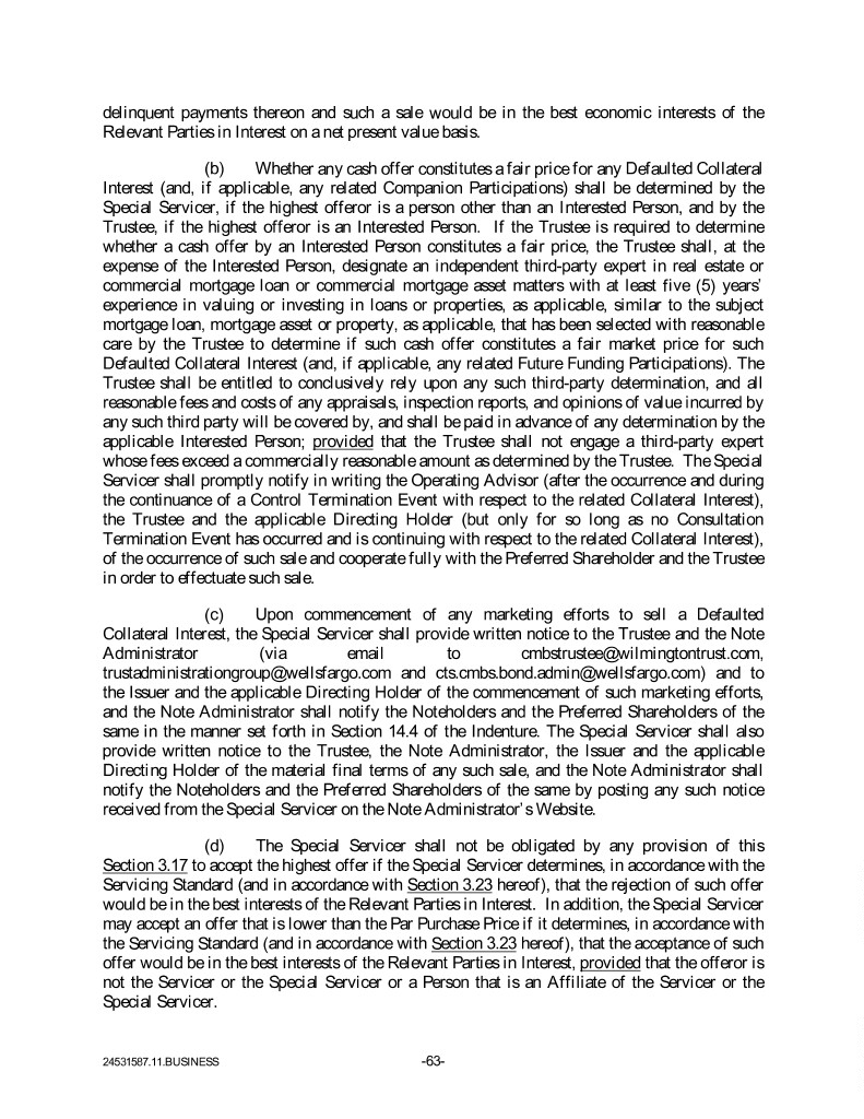 delinquent payments thereon and such a sale would be in the best economic interests of the Relevant Parties in Interest on a net present value basis. (b) Whether any cash offer constitutes a fair price for any Defaulted Collateral Interest (and, if applicable, any related Companion Participations) shall be determined by the Special Servicer, if the highest offeror is a person other than an Interested Person, and by the Trustee, if the highest offeror is an Interested Person. If the Trustee is required to determine whether a cash offer by an Interested Person constitutes a fair price, the Trustee shall, at the expense of the Interested Person, designate an independent third-party expert in real estate or commercial mortgage loan or commercial mortgage asset matters with at least five (5) years’ experience in valuing or investing in loans or properties, as applicable, similar to the subject mortgage loan, mortgage asset or property, as applicable, that has been selected with reasonable care by the Trustee to determine if such cash offer constitutes a fair market price for such Defaulted Collateral Interest (and, if applicable, any related Future Funding Participations). The Trustee shall be entitled to conclusively rely upon any such third-party determination, and all reasonable fees and costs of any appraisals, inspection reports, and opinions of value incurred by any such third party will be covered by, and shall be paid in advance of any determination by the applicable Interested Person; provided that the Trustee shall not engage a third-party expert whose fees exceed a commercially reasonable amount as determined by the Trustee. The Special Servicer shall promptly notify in writing the Operating Advisor (after the occurrence and during the continuance of a Control Termination Event with respect to the related Collateral Interest), the Trustee and the applicable Directing Holder (but only for so long as no Consultation Termination Event has occurred and is continuing with respect to the related Collateral Interest), of the occurrence of such sale and cooperate fully with the Preferred Shareholder and the Trustee in order to effectuate such sale. (c) Upon commencement of any marketing efforts to sell a Defaulted Collateral Interest, the Special Servicer shall provide written notice to the Trustee and the Note Administrator (via email to cmbstrustee@wilmingtontrust.com, trustadministrationgroup@wellsfargo.com and cts.cmbs.bond.admin@wellsfargo.com) and to the Issuer and the applicable Directing Holder of the commencement of such marketing efforts, and the Note Administrator shall notify the Noteholders and the Preferred Shareholders of the same in the manner set forth in Section 14.4 of the Indenture. The Special Servicer shall also provide written notice to the Trustee, the Note Administrator, the Issuer and the applicable Directing Holder of the material final terms of any such sale, and the Note Administrator shall notify the Noteholders and the Preferred Shareholders of the same by posting any such notice received from the Special Servicer on the Note Administrator’s Website. (d) The Special Servicer shall not be obligated by any provision of this Section 3.17 to accept the highest offer if the Special Servicer determines, in accordance with the Servicing Standard (and in accordance with Section 3.23 hereof), that the rejection of such offer would be in the best interests of the Relevant Parties in Interest. In addition, the Special Servicer may accept an offer that is lower than the Par Purchase Price if it determines, in accordance with the Servicing Standard (and in accordance with Section 3.23 hereof), that the acceptance of such offer would be in the best interests of the Relevant Parties in Interest, provided that the offeror is not the Servicer or the Special Servicer or a Person that is an Affiliate of the Servicer or the Special Servicer. 24531587.11.BUSINESS -63-