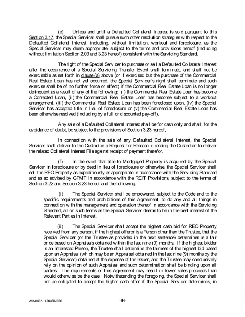 (e) Unless and until a Defaulted Collateral Interest is sold pursuant to this Section 3.17, the Special Servicer shall pursue such other resolution strategies with respect to the Defaulted Collateral Interest, including, without limitation, workout and foreclosure, as the Special Servicer may deem appropriate, subject to the terms and provisions hereof (including without limitation Section 2.03 and 3.23 hereof) consistent with the Servicing Standard. The right of the Special Servicer to purchase or sell a Defaulted Collateral Interest after the occurrence of a Special Servicing Transfer Event shall terminate, and shall not be exercisable as set forth in clause (a) above (or if exercised but the purchase of the Commercial Real Estate Loan has not yet occurred, the Special Servicer’s right shall terminate and such exercise shall be of no further force or effect) if the Commercial Real Estate Loan is no longer delinquent as a result of any of the following: (i) the Commercial Real Estate Loan has become a Corrected Loan, (ii) the Commercial Real Estate Loan has become subject to a workout arrangement, (iii) the Commercial Real Estate Loan has been foreclosed upon, (iv) the Special Servicer has accepted title in lieu of foreclosure or (v) the Commercial Real Estate Loan has been otherwise resolved (including by a full or discounted pay-off). Any sale of a Defaulted Collateral Interest shall be for cash only and shall, for the avoidance of doubt, be subject to the provisions of Section 3.23 hereof. In connection with the sale of any Defaulted Collateral Interest, the Special Servicer shall deliver to the Custodian a Request for Release, directing the Custodian to deliver the related Collateral Interest File against receipt of payment therefor. (f) In the event that title to Mortgaged Property is acquired by the Special Servicer in foreclosure or by deed in lieu of foreclosure or otherwise, the Special Servicer shall sell the REO Property as expeditiously as appropriate in accordance with the Servicing Standard and as so advised by GPMT in accordance with the REIT Provisions, subject to the terms of Section 3.22 and Section 3.23 hereof and the following: (i) The Special Servicer shall be empowered, subject to the Code and to the specific requirements and prohibitions of this Agreement, to do any and all things in connection with the management and operation thereof in accordance with the Servicing Standard, all on such terms as the Special Servicer deems to be in the best interest of the Relevant Parties in Interest. (ii) The Special Servicer shall accept the highest cash bid for REO Property received from any person, if the highest offeror is a Person other than the Trustee, that the Special Servicer (or the Trustee as provided in the next sentence) determines is a fair price based on Appraisals obtained within the last nine (9) months. If the highest bidder is an Interested Person, the Trustee shall determine the fairness of the highest bid based upon an Appraisal (which may be an Appraisal obtained in the last nine (9) months by the Special Servicer) obtained at the expense of the Issuer, and the Trustee may conclusively rely on the opinion of such Appraisal and such determination shall be binding upon all parties. The requirements of this Agreement may result in lower sales proceeds than would otherwise be the case. Notwithstanding the foregoing, the Special Servicer shall not be obligated to accept the higher cash offer if the Special Servicer determines, in 24531587.11.BUSINESS -64-