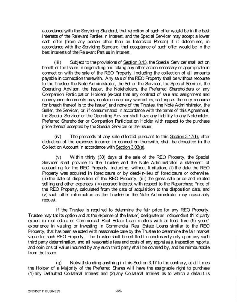 accordance with the Servicing Standard, that rejection of such offer would be in the best interests of the Relevant Parties in Interest, and the Special Servicer may accept a lower cash offer (from any person other than an Interested Person) if it determines, in accordance with the Servicing Standard, that acceptance of such offer would be in the best interests of the Relevant Parties in Interest. (iii) Subject to the provisions of Section 3.13, the Special Servicer shall act on behalf of the Issuer in negotiating and taking any other action necessary or appropriate in connection with the sale of the REO Property, including the collection of all amounts payable in connection therewith. Any sale of the REO Property shall be without recourse to the Trustee, the Note Administrator, the Seller, the Servicer, the Special Servicer, the Operating Advisor, the Issuer, the Noteholders, the Preferred Shareholders or any Companion Participation Holders (except that any contract of sale and assignment and conveyance documents may contain customary warranties, so long as the only recourse for breach thereof is to the Issuer) and none of the Trustee, the Note Administrator, the Seller, the Servicer, or, if consummated in accordance with the terms of this Agreement, the Special Servicer or the Operating Advisor shall have any liability to any Noteholder, Preferred Shareholder or Companion Participation Holder with respect to the purchase price thereof accepted by the Special Servicer or the Issuer. (iv) The proceeds of any sale effected pursuant to this Section 3.17(f), after deduction of the expenses incurred in connection therewith, shall be deposited in the Collection Account in accordance with Section 3.03(a). (v) Within thirty (30) days of the sale of the REO Property, the Special Servicer shall provide to the Trustee and the Note Administrator a statement of accounting for the REO Property, including, without limitation, (i) the date the REO Property was acquired in foreclosure or by deed-in-lieu of foreclosure or otherwise, (ii) the date of disposition of the REO Property, (iii) the gross sale price and related selling and other expenses, (iv) accrued interest with respect to the Repurchase Price of the REO Property, calculated from the date of acquisition to the disposition date, and (v) such other information as the Trustee or the Note Administrator may reasonably request. If the Trustee is required to determine the fair price for any REO Property, Trustee may (at its option and at the expense of the Issuer) designate an independent third party expert in real estate or Commercial Real Estate Loan matters with at least five (5) years’ experience in valuing or investing in Commercial Real Estate Loans similar to the REO Property, that has been selected with reasonable care by the Trustee to determine the fair market value for such REO Property. The Trustee shall be entitled to conclusively rely upon any such third party determination, and all reasonable fees and costs of any appraisals, inspection reports, and opinions of value incurred by any such third party shall be covered by, and be reimbursable from the Issuer. (g) Notwithstanding anything in this Section 3.17 to the contrary, at all times the Holder of a Majority of the Preferred Shares will have the assignable right to purchase (1) any Defaulted Collateral Interest and (2) any Collateral Interest as to which a default is 24531587.11.BUSINESS -65-