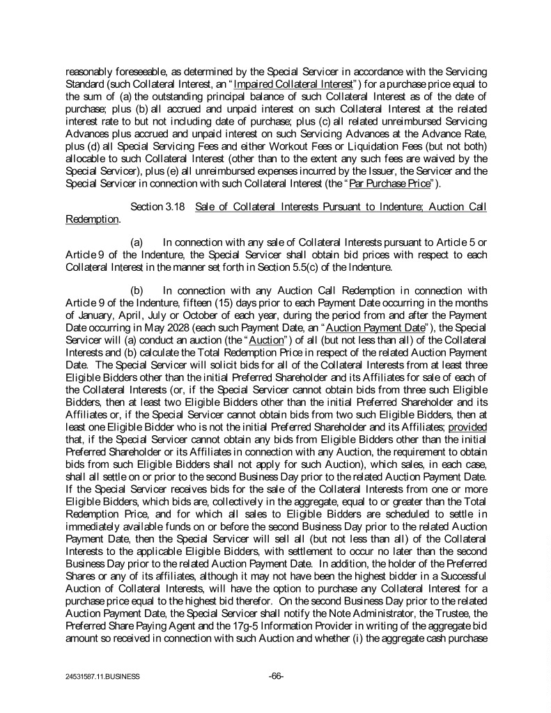 reasonably foreseeable, as determined by the Special Servicer in accordance with the Servicing Standard (such Collateral Interest, an “Impaired Collateral Interest”) for a purchase price equal to the sum of (a) the outstanding principal balance of such Collateral Interest as of the date of purchase; plus (b) all accrued and unpaid interest on such Collateral Interest at the related interest rate to but not including date of purchase; plus (c) all related unreimbursed Servicing Advances plus accrued and unpaid interest on such Servicing Advances at the Advance Rate, plus (d) all Special Servicing Fees and either Workout Fees or Liquidation Fees (but not both) allocable to such Collateral Interest (other than to the extent any such fees are waived by the Special Servicer), plus (e) all unreimbursed expenses incurred by the Issuer, the Servicer and the Special Servicer in connection with such Collateral Interest (the “Par Purchase Price”). Section 3.18 Sale of Collateral Interests Pursuant to Indenture; Auction Call Redemption. (a) In connection with any sale of Collateral Interests pursuant to Article 5 or Article 9 of the Indenture, the Special Servicer shall obtain bid prices with respect to each Collateral Interest in the manner set forth in Section 5.5(c) of the Indenture. (b) In connection with any Auction Call Redemption in connection with Article 9 of the Indenture, fifteen (15) days prior to each Payment Date occurring in the months of January, April, July or October of each year, during the period from and after the Payment Date occurring in May 2028 (each such Payment Date, an “Auction Payment Date”), the Special Servicer will (a) conduct an auction (the “Auction”) of all (but not less than all) of the Collateral Interests and (b) calculate the Total Redemption Price in respect of the related Auction Payment Date. The Special Servicer will solicit bids for all of the Collateral Interests from at least three Eligible Bidders other than the initial Preferred Shareholder and its Affiliates for sale of each of the Collateral Interests (or, if the Special Servicer cannot obtain bids from three such Eligible Bidders, then at least two Eligible Bidders other than the initial Preferred Shareholder and its Affiliates or, if the Special Servicer cannot obtain bids from two such Eligible Bidders, then at least one Eligible Bidder who is not the initial Preferred Shareholder and its Affiliates; provided that, if the Special Servicer cannot obtain any bids from Eligible Bidders other than the initial Preferred Shareholder or its Affiliates in connection with any Auction, the requirement to obtain bids from such Eligible Bidders shall not apply for such Auction), which sales, in each case, shall all settle on or prior to the second Business Day prior to the related Auction Payment Date. If the Special Servicer receives bids for the sale of the Collateral Interests from one or more Eligible Bidders, which bids are, collectively in the aggregate, equal to or greater than the Total Redemption Price, and for which all sales to Eligible Bidders are scheduled to settle in immediately available funds on or before the second Business Day prior to the related Auction Payment Date, then the Special Servicer will sell all (but not less than all) of the Collateral Interests to the applicable Eligible Bidders, with settlement to occur no later than the second Business Day prior to the related Auction Payment Date. In addition, the holder of the Preferred Shares or any of its affiliates, although it may not have been the highest bidder in a Successful Auction of Collateral Interests, will have the option to purchase any Collateral Interest for a purchase price equal to the highest bid therefor. On the second Business Day prior to the related Auction Payment Date, the Special Servicer shall notify the Note Administrator, the Trustee, the Preferred Share Paying Agent and the 17g-5 Information Provider in writing of the aggregate bid amount so received in connection with such Auction and whether (i) the aggregate cash purchase 24531587.11.BUSINESS -66-