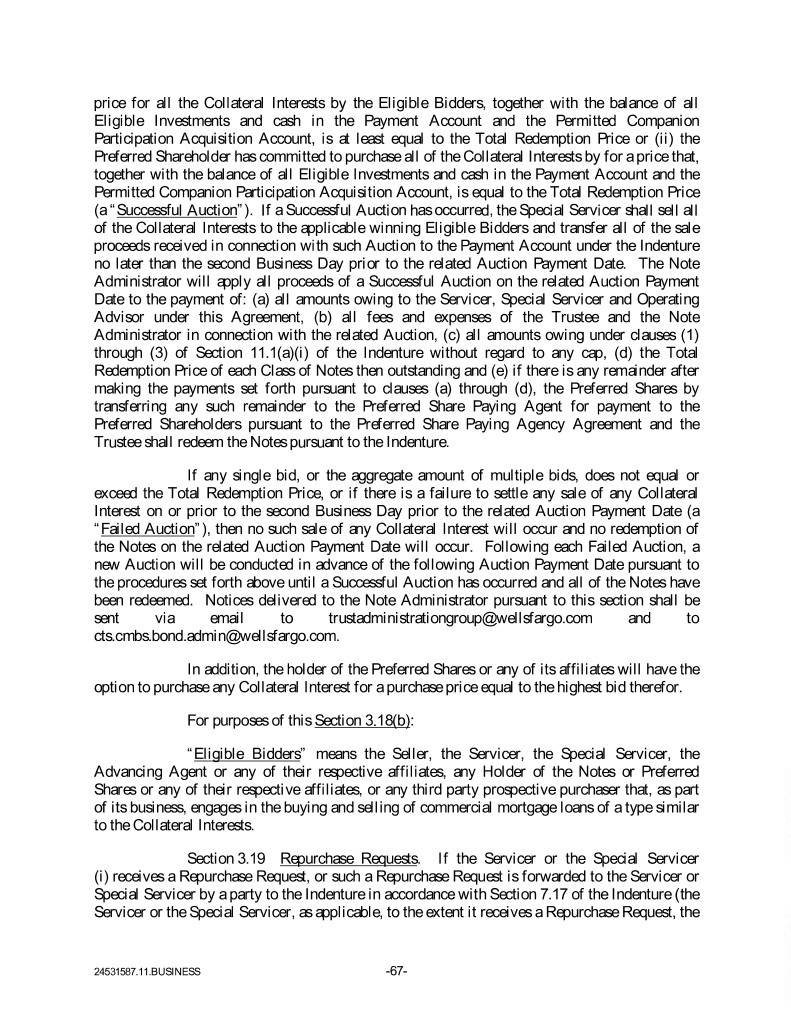 price for all the Collateral Interests by the Eligible Bidders, together with the balance of all Eligible Investments and cash in the Payment Account and the Permitted Companion Participation Acquisition Account, is at least equal to the Total Redemption Price or (ii) the Preferred Shareholder has committed to purchase all of the Collateral Interests by for a price that, together with the balance of all Eligible Investments and cash in the Payment Account and the Permitted Companion Participation Acquisition Account, is equal to the Total Redemption Price (a “Successful Auction”). If a Successful Auction has occurred, the Special Servicer shall sell all of the Collateral Interests to the applicable winning Eligible Bidders and transfer all of the sale proceeds received in connection with such Auction to the Payment Account under the Indenture no later than the second Business Day prior to the related Auction Payment Date. The Note Administrator will apply all proceeds of a Successful Auction on the related Auction Payment Date to the payment of: (a) all amounts owing to the Servicer, Special Servicer and Operating Advisor under this Agreement, (b) all fees and expenses of the Trustee and the Note Administrator in connection with the related Auction, (c) all amounts owing under clauses (1) through (3) of Section 11.1(a)(i) of the Indenture without regard to any cap, (d) the Total Redemption Price of each Class of Notes then outstanding and (e) if there is any remainder after making the payments set forth pursuant to clauses (a) through (d), the Preferred Shares by transferring any such remainder to the Preferred Share Paying Agent for payment to the Preferred Shareholders pursuant to the Preferred Share Paying Agency Agreement and the Trustee shall redeem the Notes pursuant to the Indenture. If any single bid, or the aggregate amount of multiple bids, does not equal or exceed the Total Redemption Price, or if there is a failure to settle any sale of any Collateral Interest on or prior to the second Business Day prior to the related Auction Payment Date (a “Failed Auction”), then no such sale of any Collateral Interest will occur and no redemption of the Notes on the related Auction Payment Date will occur. Following each Failed Auction, a new Auction will be conducted in advance of the following Auction Payment Date pursuant to the procedures set forth above until a Successful Auction has occurred and all of the Notes have been redeemed. Notices delivered to the Note Administrator pursuant to this section shall be sent via email to trustadministrationgroup@wellsfargo.com and to cts.cmbs.bond.admin@wellsfargo.com. In addition, the holder of the Preferred Shares or any of its affiliates will have the option to purchase any Collateral Interest for a purchase price equal to the highest bid therefor. For purposes of this Section 3.18(b): “Eligible Bidders” means the Seller, the Servicer, the Special Servicer, the Advancing Agent or any of their respective affiliates, any Holder of the Notes or Preferred Shares or any of their respective affiliates, or any third party prospective purchaser that, as part of its business, engages in the buying and selling of commercial mortgage loans of a type similar to the Collateral Interests. Section 3.19 Repurchase Requests. If the Servicer or the Special Servicer (i) receives a Repurchase Request, or such a Repurchase Request is forwarded to the Servicer or Special Servicer by a party to the Indenture in accordance with Section 7.17 of the Indenture (the Servicer or the Special Servicer, as applicable, to the extent it receives a Repurchase Request, the 24531587.11.BUSINESS -67-