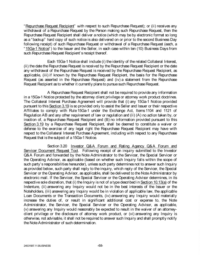 “Repurchase Request Recipient” with respect to such Repurchase Request); or (ii) receives any withdrawal of a Repurchase Request by the Person making such Repurchase Request, then the Repurchase Request Recipient shall deliver a notice (which may be by electronic format so long as a “backup” hard copy of such notice is also delivered on or prior to the second Business Day following receipt) of such Repurchase Request or withdrawal of a Repurchase Request (each, a “15Ga-1 Notice”) to the Issuer and the Seller, in each case within ten (10) Business Days from such Repurchase Request Recipient’s receipt thereof. Each 15Ga-1 Notice shall include (i) the identity of the related Collateral Interest, (ii) the date the Repurchase Request is received by the Repurchase Request Recipient or the date any withdrawal of the Repurchase Request is received by the Repurchase Request Recipient, as applicable, (iii) if known by the Repurchase Request Recipient, the basis for the Repurchase Request (as asserted in the Repurchase Request) and (iv) a statement from the Repurchase Request Recipient as to whether it currently plans to pursue such Repurchase Request. A Repurchase Request Recipient shall not be required to provide any information in a 15Ga-1 Notice protected by the attorney client privilege or attorney work product doctrines. The Collateral Interest Purchase Agreement will provide that (i) any 15Ga-1 Notice provided pursuant to this Section 3.19 is so provided only to assist the Seller and Issuer or their respective Affiliates to comply with Rule 15Ga-1 under the Exchange Act, Items 1104 and 1121 of Regulation AB and any other requirement of law or regulation and (ii) (A) no action taken by, or inaction of, a Repurchase Request Recipient and (B) no information provided pursuant to this Section 3.19 by a Repurchase Request Recipient, shall be deemed to constitute a waiver or defense to the exercise of any legal right the Repurchase Request Recipient may have with respect to the Collateral Interest Purchase Agreement, including with respect to any Repurchase Request that is the subject of a 15Ga-1 Notice. Section 3.20 Investor Q&A Forum and Rating Agency Q&A Forum and Servicer Document Request Tool. Following receipt of an inquiry submitted to the Investor Q&A Forum and forwarded by the Note Administrator to the Servicer, the Special Servicer or the Operating Advisor, as applicable (based on whether such Inquiry falls within the scope of such party’s responsibilities hereunder), unless such party determines not to answer such Inquiry as provided below, such party shall reply to the inquiry, which reply of the Servicer, the Special Servicer or the Operating Advisor, as applicable, shall be delivered to the Note Administrator by electronic mail. If the Servicer, the Special Servicer or the Operating Advisor determines, in its respective sole discretion, that (i) the Inquiry is not of a type described in Section 10.13(a) of the Indenture, (ii) answering any Inquiry would not be in the best interests of the Issuer or the Noteholders, (iii) answering any Inquiry would be in violation of applicable law, the applicable Loan Documents or the Transaction Documents, (iv) answering any Inquiry would materially increase the duties of, or result in significant additional cost or expense to, the Note Administrator, the Servicer, the Special Servicer or the Operating Advisor, as applicable, (v) answering any Inquiry would reasonably be expected to result in the waiver of an attorney- client privilege or the disclosure of attorney work product, or (vi) answering any Inquiry is otherwise, not advisable, it shall not be required to answer such Inquiry and shall promptly notify the Note Administrator of such determination. 24531587.11.BUSINESS -68-