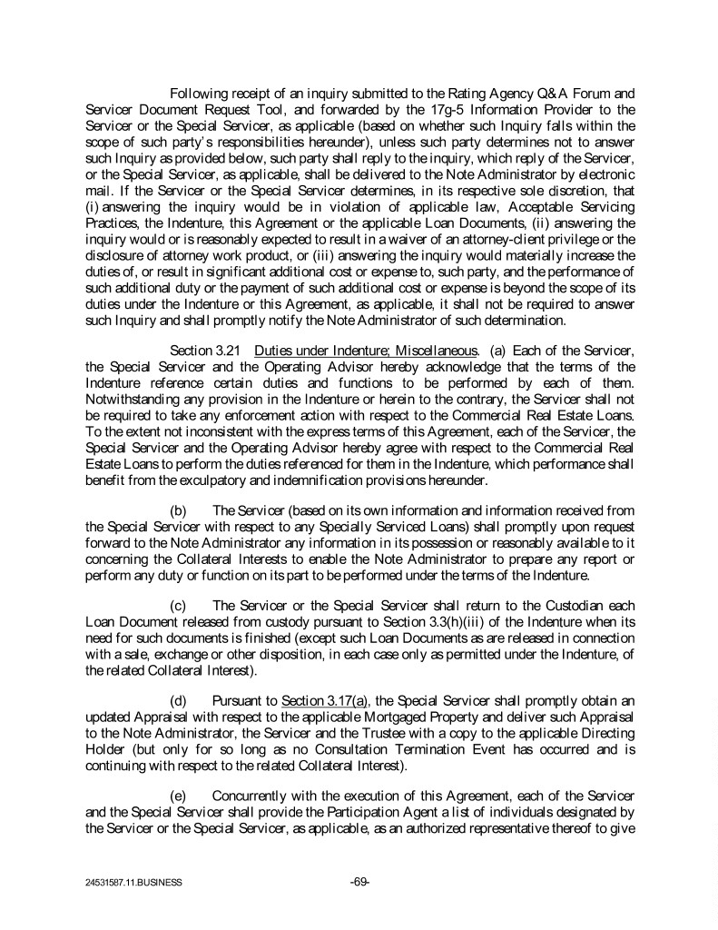 Following receipt of an inquiry submitted to the Rating Agency Q&A Forum and Servicer Document Request Tool, and forwarded by the 17g-5 Information Provider to the Servicer or the Special Servicer, as applicable (based on whether such Inquiry falls within the scope of such party’s responsibilities hereunder), unless such party determines not to answer such Inquiry as provided below, such party shall reply to the inquiry, which reply of the Servicer, or the Special Servicer, as applicable, shall be delivered to the Note Administrator by electronic mail. If the Servicer or the Special Servicer determines, in its respective sole discretion, that (i) answering the inquiry would be in violation of applicable law, Acceptable Servicing Practices, the Indenture, this Agreement or the applicable Loan Documents, (ii) answering the inquiry would or is reasonably expected to result in a waiver of an attorney-client privilege or the disclosure of attorney work product, or (iii) answering the inquiry would materially increase the duties of, or result in significant additional cost or expense to, such party, and the performance of such additional duty or the payment of such additional cost or expense is beyond the scope of its duties under the Indenture or this Agreement, as applicable, it shall not be required to answer such Inquiry and shall promptly notify the Note Administrator of such determination. Section 3.21 Duties under Indenture; Miscellaneous. (a) Each of the Servicer, the Special Servicer and the Operating Advisor hereby acknowledge that the terms of the Indenture reference certain duties and functions to be performed by each of them. Notwithstanding any provision in the Indenture or herein to the contrary, the Servicer shall not be required to take any enforcement action with respect to the Commercial Real Estate Loans. To the extent not inconsistent with the express terms of this Agreement, each of the Servicer, the Special Servicer and the Operating Advisor hereby agree with respect to the Commercial Real Estate Loans to perform the duties referenced for them in the Indenture, which performance shall benefit from the exculpatory and indemnification provisions hereunder. (b) The Servicer (based on its own information and information received from the Special Servicer with respect to any Specially Serviced Loans) shall promptly upon request forward to the Note Administrator any information in its possession or reasonably available to it concerning the Collateral Interests to enable the Note Administrator to prepare any report or perform any duty or function on its part to be performed under the terms of the Indenture. (c) The Servicer or the Special Servicer shall return to the Custodian each Loan Document released from custody pursuant to Section 3.3(h)(iii) of the Indenture when its need for such documents is finished (except such Loan Documents as are released in connection with a sale, exchange or other disposition, in each case only as permitted under the Indenture, of the related Collateral Interest). (d) Pursuant to Section 3.17(a), the Special Servicer shall promptly obtain an updated Appraisal with respect to the applicable Mortgaged Property and deliver such Appraisal to the Note Administrator, the Servicer and the Trustee with a copy to the applicable Directing Holder (but only for so long as no Consultation Termination Event has occurred and is continuing with respect to the related Collateral Interest). (e) Concurrently with the execution of this Agreement, each of the Servicer and the Special Servicer shall provide the Participation Agent a list of individuals designated by the Servicer or the Special Servicer, as applicable, as an authorized representative thereof to give 24531587.11.BUSINESS -69-