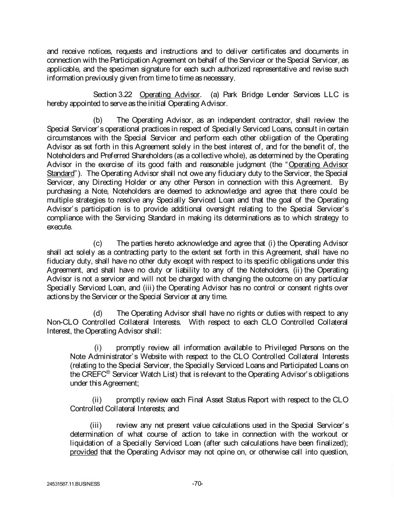 and receive notices, requests and instructions and to deliver certificates and documents in connection with the Participation Agreement on behalf of the Servicer or the Special Servicer, as applicable, and the specimen signature for each such authorized representative and revise such information previously given from time to time as necessary. Section 3.22 Operating Advisor. (a) Park Bridge Lender Services LLC is hereby appointed to serve as the initial Operating Advisor. (b) The Operating Advisor, as an independent contractor, shall review the Special Servicer’s operational practices in respect of Specially Serviced Loans, consult in certain circumstances with the Special Servicer and perform each other obligation of the Operating Advisor as set forth in this Agreement solely in the best interest of, and for the benefit of, the Noteholders and Preferred Shareholders (as a collective whole), as determined by the Operating Advisor in the exercise of its good faith and reasonable judgment (the “Operating Advisor Standard”). The Operating Advisor shall not owe any fiduciary duty to the Servicer, the Special Servicer, any Directing Holder or any other Person in connection with this Agreement. By purchasing a Note, Noteholders are deemed to acknowledge and agree that there could be multiple strategies to resolve any Specially Serviced Loan and that the goal of the Operating Advisor’s participation is to provide additional oversight relating to the Special Servicer’s compliance with the Servicing Standard in making its determinations as to which strategy to execute. (c) The parties hereto acknowledge and agree that (i) the Operating Advisor shall act solely as a contracting party to the extent set forth in this Agreement, shall have no fiduciary duty, shall have no other duty except with respect to its specific obligations under this Agreement, and shall have no duty or liability to any of the Noteholders, (ii) the Operating Advisor is not a servicer and will not be charged with changing the outcome on any particular Specially Serviced Loan, and (iii) the Operating Advisor has no control or consent rights over actions by the Servicer or the Special Servicer at any time. (d) The Operating Advisor shall have no rights or duties with respect to any Non-CLO Controlled Collateral Interests. With respect to each CLO Controlled Collateral Interest, the Operating Advisor shall: (i) promptly review all information available to Privileged Persons on the Note Administrator’s Website with respect to the CLO Controlled Collateral Interests (relating to the Special Servicer, the Specially Serviced Loans and Participated Loans on the CREFC® Servicer Watch List) that is relevant to the Operating Advisor’s obligations under this Agreement; (ii) promptly review each Final Asset Status Report with respect to the CLO Controlled Collateral Interests; and (iii) review any net present value calculations used in the Special Servicer’s determination of what course of action to take in connection with the workout or liquidation of a Specially Serviced Loan (after such calculations have been finalized); provided that the Operating Advisor may not opine on, or otherwise call into question, 24531587.11.BUSINESS -70-