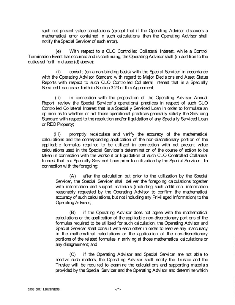 such net present value calculations (except that if the Operating Advisor discovers a mathematical error contained in such calculations, then the Operating Advisor shall notify the Special Servicer of such error). (e) With respect to a CLO Controlled Collateral Interest, while a Control Termination Event has occurred and is continuing, the Operating Advisor shall (in addition to the duties set forth in clause (d) above): (i) consult (on a non-binding basis) with the Special Servicer in accordance with the Operating Advisor Standard with regard to Major Decisions and Asset Status Reports with respect to such CLO Controlled Collateral Interest that is a Specially Serviced Loan as set forth in Section 3.23 of this Agreement; (ii) in connection with the preparation of the Operating Advisor Annual Report, review the Special Servicer’s operational practices in respect of such CLO Controlled Collateral Interest that is a Specially Serviced Loan in order to formulate an opinion as to whether or not those operational practices generally satisfy the Servicing Standard with respect to the resolution and/or liquidation of any Specially Serviced Loan or REO Property; (iii) promptly recalculate and verify the accuracy of the mathematical calculations and the corresponding application of the non-discretionary portion of the applicable formulas required to be utilized in connection with net present value calculations used in the Special Servicer’s determination of the course of action to be taken in connection with the workout or liquidation of such CLO Controlled Collateral Interest that is a Specially Serviced Loan prior to utilization by the Special Servicer. In connection with the foregoing: (A) after the calculation but prior to the utilization by the Special Servicer, the Special Servicer shall deliver the foregoing calculations together with information and support materials (including such additional information reasonably requested by the Operating Advisor to confirm the mathematical accuracy of such calculations, but not including any Privileged Information) to the Operating Advisor; (B) if the Operating Advisor does not agree with the mathematical calculations or the application of the applicable non-discretionary portions of the formulas required to be utilized for such calculation, the Operating Advisor and Special Servicer shall consult with each other in order to resolve any inaccuracy in the mathematical calculations or the application of the non-discretionary portions of the related formulas in arriving at those mathematical calculations or any disagreement; and (C) if the Operating Advisor and Special Servicer are not able to resolve such matters, the Operating Advisor shall notify the Trustee and the Trustee will be required to examine the calculations and supporting materials provided by the Special Servicer and the Operating Advisor and determine which 24531587.11.BUSINESS -71-