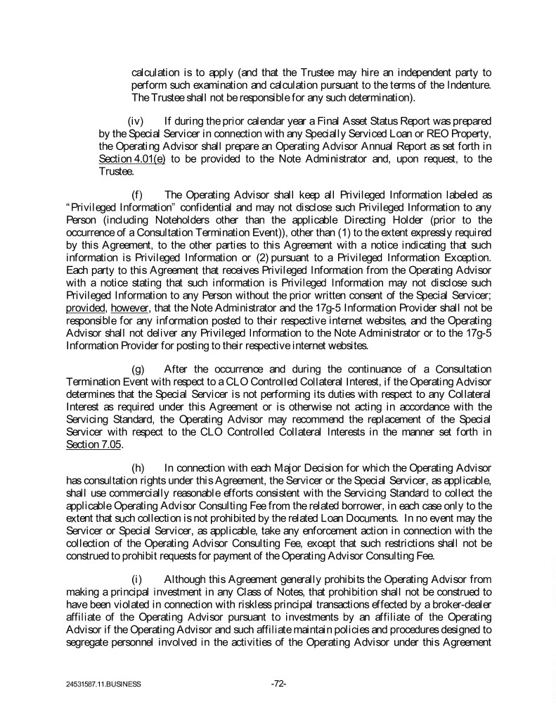calculation is to apply (and that the Trustee may hire an independent party to perform such examination and calculation pursuant to the terms of the Indenture. The Trustee shall not be responsible for any such determination). (iv) If during the prior calendar year a Final Asset Status Report was prepared by the Special Servicer in connection with any Specially Serviced Loan or REO Property, the Operating Advisor shall prepare an Operating Advisor Annual Report as set forth in Section 4.01(e) to be provided to the Note Administrator and, upon request, to the Trustee. (f) The Operating Advisor shall keep all Privileged Information labeled as “Privileged Information” confidential and may not disclose such Privileged Information to any Person (including Noteholders other than the applicable Directing Holder (prior to the occurrence of a Consultation Termination Event)), other than (1) to the extent expressly required by this Agreement, to the other parties to this Agreement with a notice indicating that such information is Privileged Information or (2) pursuant to a Privileged Information Exception. Each party to this Agreement that receives Privileged Information from the Operating Advisor with a notice stating that such information is Privileged Information may not disclose such Privileged Information to any Person without the prior written consent of the Special Servicer; provided, however, that the Note Administrator and the 17g-5 Information Provider shall not be responsible for any information posted to their respective internet websites, and the Operating Advisor shall not deliver any Privileged Information to the Note Administrator or to the 17g-5 Information Provider for posting to their respective internet websites. (g) After the occurrence and during the continuance of a Consultation Termination Event with respect to a CLO Controlled Collateral Interest, if the Operating Advisor determines that the Special Servicer is not performing its duties with respect to any Collateral Interest as required under this Agreement or is otherwise not acting in accordance with the Servicing Standard, the Operating Advisor may recommend the replacement of the Special Servicer with respect to the CLO Controlled Collateral Interests in the manner set forth in Section 7.05. (h) In connection with each Major Decision for which the Operating Advisor has consultation rights under this Agreement, the Servicer or the Special Servicer, as applicable, shall use commercially reasonable efforts consistent with the Servicing Standard to collect the applicable Operating Advisor Consulting Fee from the related borrower, in each case only to the extent that such collection is not prohibited by the related Loan Documents. In no event may the Servicer or Special Servicer, as applicable, take any enforcement action in connection with the collection of the Operating Advisor Consulting Fee, except that such restrictions shall not be construed to prohibit requests for payment of the Operating Advisor Consulting Fee. (i) Although this Agreement generally prohibits the Operating Advisor from making a principal investment in any Class of Notes, that prohibition shall not be construed to have been violated in connection with riskless principal transactions effected by a broker-dealer affiliate of the Operating Advisor pursuant to investments by an affiliate of the Operating Advisor if the Operating Advisor and such affiliate maintain policies and procedures designed to segregate personnel involved in the activities of the Operating Advisor under this Agreement 24531587.11.BUSINESS -72-