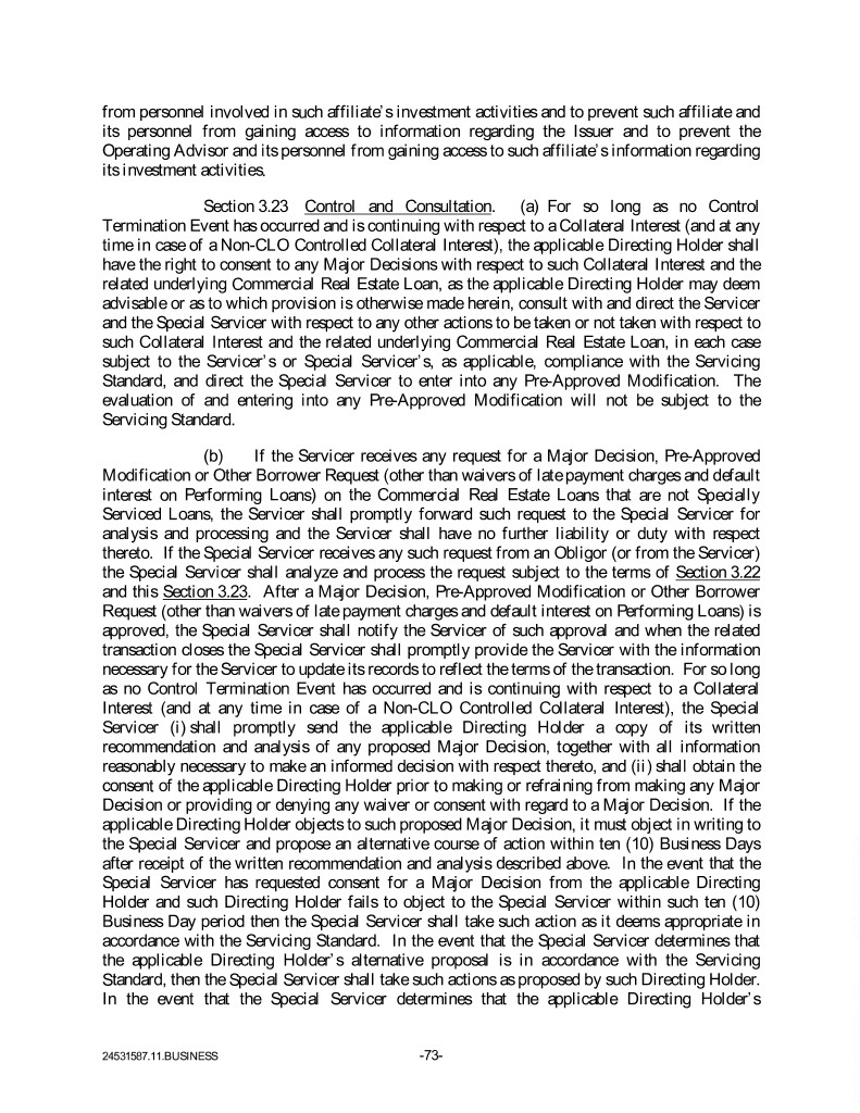 from personnel involved in such affiliate’s investment activities and to prevent such affiliate and its personnel from gaining access to information regarding the Issuer and to prevent the Operating Advisor and its personnel from gaining access to such affiliate’s information regarding its investment activities. Section 3.23 Control and Consultation. (a) For so long as no Control Termination Event has occurred and is continuing with respect to a Collateral Interest (and at any time in case of a Non-CLO Controlled Collateral Interest), the applicable Directing Holder shall have the right to consent to any Major Decisions with respect to such Collateral Interest and the related underlying Commercial Real Estate Loan, as the applicable Directing Holder may deem advisable or as to which provision is otherwise made herein, consult with and direct the Servicer and the Special Servicer with respect to any other actions to be taken or not taken with respect to such Collateral Interest and the related underlying Commercial Real Estate Loan, in each case subject to the Servicer’s or Special Servicer’s, as applicable, compliance with the Servicing Standard, and direct the Special Servicer to enter into any Pre-Approved Modification. The evaluation of and entering into any Pre-Approved Modification will not be subject to the Servicing Standard. (b) If the Servicer receives any request for a Major Decision, Pre-Approved Modification or Other Borrower Request (other than waivers of late payment charges and default interest on Performing Loans) on the Commercial Real Estate Loans that are not Specially Serviced Loans, the Servicer shall promptly forward such request to the Special Servicer for analysis and processing and the Servicer shall have no further liability or duty with respect thereto. If the Special Servicer receives any such request from an Obligor (or from the Servicer) the Special Servicer shall analyze and process the request subject to the terms of Section 3.22 and this Section 3.23. After a Major Decision, Pre-Approved Modification or Other Borrower Request (other than waivers of late payment charges and default interest on Performing Loans) is approved, the Special Servicer shall notify the Servicer of such approval and when the related transaction closes the Special Servicer shall promptly provide the Servicer with the information necessary for the Servicer to update its records to reflect the terms of the transaction. For so long as no Control Termination Event has occurred and is continuing with respect to a Collateral Interest (and at any time in case of a Non-CLO Controlled Collateral Interest), the Special Servicer (i) shall promptly send the applicable Directing Holder a copy of its written recommendation and analysis of any proposed Major Decision, together with all information reasonably necessary to make an informed decision with respect thereto, and (ii) shall obtain the consent of the applicable Directing Holder prior to making or refraining from making any Major Decision or providing or denying any waiver or consent with regard to a Major Decision. If the applicable Directing Holder objects to such proposed Major Decision, it must object in writing to the Special Servicer and propose an alternative course of action within ten (10) Business Days after receipt of the written recommendation and analysis described above. In the event that the Special Servicer has requested consent for a Major Decision from the applicable Directing Holder and such Directing Holder fails to object to the Special Servicer within such ten (10) Business Day period then the Special Servicer shall take such action as it deems appropriate in accordance with the Servicing Standard. In the event that the Special Servicer determines that the applicable Directing Holder’s alternative proposal is in accordance with the Servicing Standard, then the Special Servicer shall take such actions as proposed by such Directing Holder. In the event that the Special Servicer determines that the applicable Directing Holder’s 24531587.11.BUSINESS -73-
