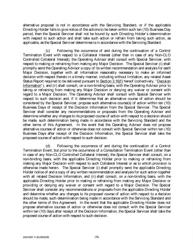alternative proposal is not in accordance with the Servicing Standard, or if the applicable Directing Holder fails to give notice of the actions to be taken within such ten (10) Business Day period, then the Special Servicer shall not be bound by such Directing Holder’s determination with respect to such action and shall take such action or refrain from taking such action, as applicable, as the Special Servicer determines is in accordance with the Servicing Standard. (c) Following the occurrence of and during the continuation of a Control Termination Event with respect to a Collateral Interest (other than in case of any Non-CLO Controlled Collateral Interest), the Operating Advisor shall consult with Special Servicer, with respect to making or refraining from making any Major Decision. The Special Servicer (i) shall promptly send the Operating Advisor a copy of its written recommendation and analysis for each Major Decision, together with all information reasonably necessary to make an informed decision with respect thereto in a timely manner, including without limitation, any related Asset Status Report required to be delivered pursuant to Section 3.16(f) hereof (collectively, “Decision Information”), and (ii) shall consult, on a non-binding basis, with the Operating Advisor prior to taking or refraining from making any Major Decision or denying any waiver or consent with regard to a Major Decision. The Operating Advisor shall consult with Special Servicer with respect to such decision and, if it determines that an alternative course of action should be considered by the Special Servicer, propose such alternative course(s) of action within ten (10) Business Days of receipt of the Decision Information from the Special Servicer. The Special Servicer shall consider any recommendations or proposals from the Operating Advisor and determine whether any changes to its proposed course of action with respect to a decision should be made, such determination being made in accordance with the Servicing Standard and the other terms of this Agreement. In the event that the Operating Advisor does not propose alternative courses of action or otherwise does not consult with Special Servicer within ten (10) Business Days after receipt of the Decision Information, the Special Servicer shall take the proposed course of action with respect to such decision. (d) Following the occurrence of and during the continuation of a Control Termination Event, but prior to the occurrence of a Consultation Termination Event (other than in case of any Non-CLO Controlled Collateral Interest), the Special Servicer shall consult, on a non-binding basis, with the applicable Directing Holder prior to making or refraining from making any Major Decision with respect to such Collateral Interest or as to which provision is otherwise made herein. The Special Servicer (i) shall promptly send the applicable Directing Holder notice of and a copy of any written recommendation and analysis for such action together with all related Decision Information, and (ii) shall consult, on a non-binding basis, with the applicable Directing Holder prior to making or refraining from making any Major Decision or providing or denying any waiver or consent with regard to a Major Decision. The Special Servicer shall consider any recommendations or proposals from the applicable Directing Holder and determine whether any changes to its proposed course of action with respect to a decision should be made, such determination being made in accordance with the Servicing Standard and the other terms of this Agreement. In the event that the applicable Directing Holder does not propose alternative courses of action or otherwise does not consult with the Special Servicer within ten (10) days after receipt of the Decision Information, the Special Servicer shall take the proposed course of action with respect to such decision. 24531587.11.BUSINESS -74-