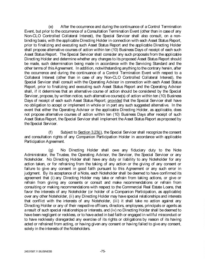 (e) After the occurrence and during the continuance of a Control Termination Event, but prior to the occurrence of a Consultation Termination Event (other than in case of any Non-CLO Controlled Collateral Interest), the Special Servicer shall also consult, on a non- binding basis, with the applicable Directing Holder in connection with each Asset Status Report, prior to finalizing and executing such Asset Status Report and the applicable Directing Holder shall propose alternative courses of action within ten (10) Business Days of receipt of each such Asset Status Report. The Special Servicer shall consider any such proposals from the applicable Directing Holder and determine whether any changes to its proposed Asset Status Report should be made, such determination being made in accordance with the Servicing Standard and the other terms of this Agreement. In addition, notwithstanding anything to the contrary herein, after the occurrence and during the continuance of a Control Termination Event with respect to a Collateral Interest (other than in case of any Non-CLO Controlled Collateral Interest), the Special Servicer shall consult with the Operating Advisor in connection with each Asset Status Report, prior to finalizing and executing such Asset Status Report and the Operating Advisor shall, if it determines that an alternative course of action should be considered by the Special Servicer, propose, by written notice, such alternative course(s) of action within ten (10) Business Days of receipt of each such Asset Status Report; provided that the Special Servicer shall have no obligation to accept or implement in whole or in part any such suggested alternative. In the event that either the Operating Advisor or the applicable Directing Holder, as applicable, does not propose alternative courses of action within ten (10) Business Days after receipt of such Asset Status Report, the Special Servicer shall implement the Asset Status Report as proposed by the Special Servicer. (f) Subject to Section 3.23(j), the Special Servicer shall recognize the consent and consultation rights of any Companion Participation Holder in accordance with applicable Participation Agreement. (g) No Directing Holder shall owe any fiduciary duty to the Note Administrator, the Trustee, the Operating Advisor, the Servicer, the Special Servicer or any Noteholder. No Directing Holder shall have any duty or liability to any Noteholder for any action taken, or for refraining from the taking of any action or the giving of any consent or failure to give any consent in good faith pursuant to this Agreement or any such error in judgment. By its acceptance of a Note, each Noteholder shall be deemed to have confirmed its agreement that (i) any Directing Holder may take or refrain from taking actions, or give or refrain from giving any consents or consult and make recommendations or refrain from consulting or making recommendations with respect to the Commercial Real Estate Loans, that favor the interests of any Noteholder (or holder of a Companion Participation, as applicable) over any other Noteholder, (ii) any Directing Holder may have special relationships and interests that conflict with the interests of any Noteholder, (iii) it shall take no action against any Directing Holder or any of their respective officers, directors, employees, principals or agents as a result of such special relationships or interests, and (iv) no Directing Holder shall be deemed to have been negligent or reckless, or to have acted in bad faith or engaged in willful misconduct or to have recklessly disregarded any exercise of its rights or obligations by reason of its having acted or refrained from acting, or having given any consent or having failed to give any consent, solely in the interests of the Noteholders. 24531587.11.BUSINESS -75-