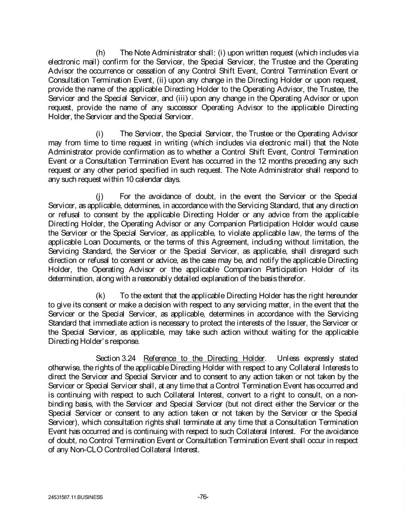 (h) The Note Administrator shall: (i) upon written request (which includes via electronic mail) confirm for the Servicer, the Special Servicer, the Trustee and the Operating Advisor the occurrence or cessation of any Control Shift Event, Control Termination Event or Consultation Termination Event, (ii) upon any change in the Directing Holder or upon request, provide the name of the applicable Directing Holder to the Operating Advisor, the Trustee, the Servicer and the Special Servicer, and (iii) upon any change in the Operating Advisor or upon request, provide the name of any successor Operating Advisor to the applicable Directing Holder, the Servicer and the Special Servicer. (i) The Servicer, the Special Servicer, the Trustee or the Operating Advisor may from time to time request in writing (which includes via electronic mail) that the Note Administrator provide confirmation as to whether a Control Shift Event, Control Termination Event or a Consultation Termination Event has occurred in the 12 months preceding any such request or any other period specified in such request. The Note Administrator shall respond to any such request within 10 calendar days. (j) For the avoidance of doubt, in the event the Servicer or the Special Servicer, as applicable, determines, in accordance with the Servicing Standard, that any direction or refusal to consent by the applicable Directing Holder or any advice from the applicable Directing Holder, the Operating Advisor or any Companion Participation Holder would cause the Servicer or the Special Servicer, as applicable, to violate applicable law, the terms of the applicable Loan Documents, or the terms of this Agreement, including without limitation, the Servicing Standard, the Servicer or the Special Servicer, as applicable, shall disregard such direction or refusal to consent or advice, as the case may be, and notify the applicable Directing Holder, the Operating Advisor or the applicable Companion Participation Holder of its determination, along with a reasonably detailed explanation of the basis therefor. (k) To the extent that the applicable Directing Holder has the right hereunder to give its consent or make a decision with respect to any servicing matter, in the event that the Servicer or the Special Servicer, as applicable, determines in accordance with the Servicing Standard that immediate action is necessary to protect the interests of the Issuer, the Servicer or the Special Servicer, as applicable, may take such action without waiting for the applicable Directing Holder’s response. Section 3.24 Reference to the Directing Holder. Unless expressly stated otherwise, the rights of the applicable Directing Holder with respect to any Collateral Interests to direct the Servicer and Special Servicer and to consent to any action taken or not taken by the Servicer or Special Servicer shall, at any time that a Control Termination Event has occurred and is continuing with respect to such Collateral Interest, convert to a right to consult, on a non- binding basis, with the Servicer and Special Servicer (but not direct either the Servicer or the Special Servicer or consent to any action taken or not taken by the Servicer or the Special Servicer), which consultation rights shall terminate at any time that a Consultation Termination Event has occurred and is continuing with respect to such Collateral Interest. For the avoidance of doubt, no Control Termination Event or Consultation Termination Event shall occur in respect of any Non-CLO Controlled Collateral Interest. 24531587.11.BUSINESS -76-