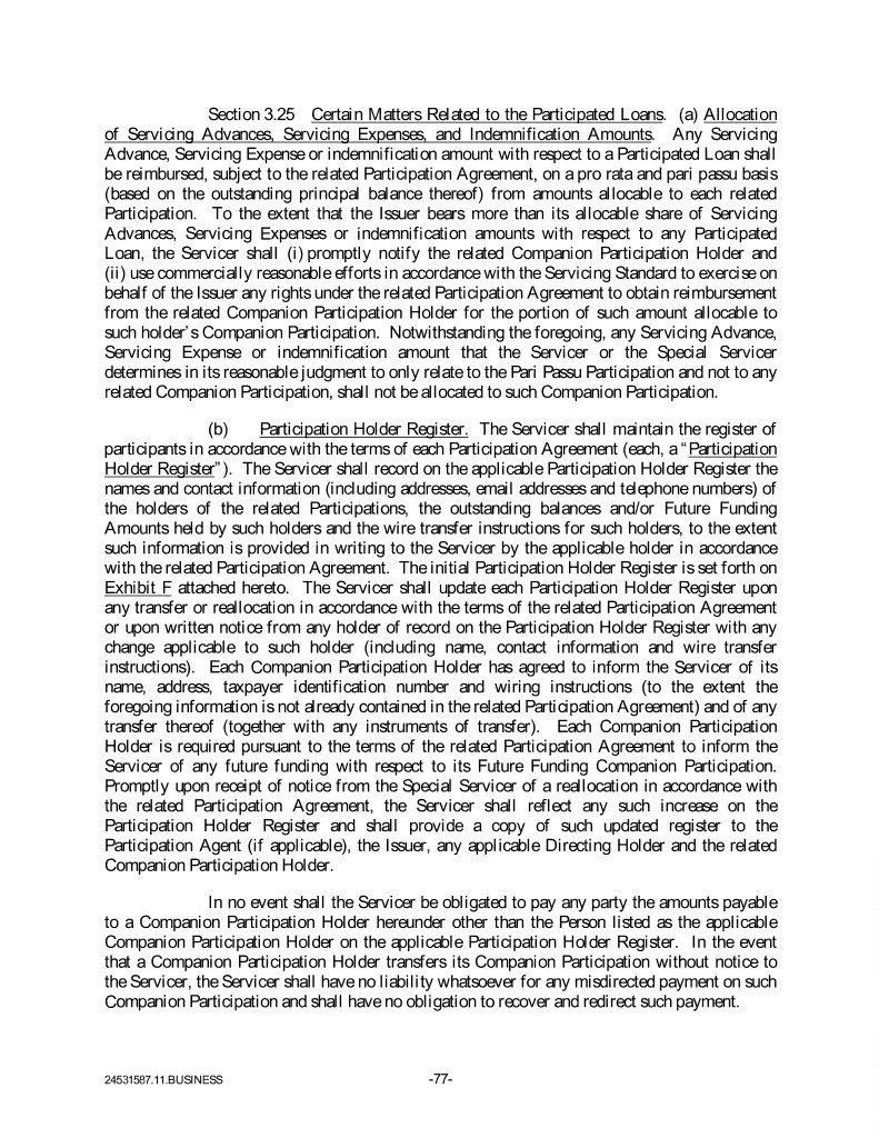 Section 3.25 Certain Matters Related to the Participated Loans. (a) Allocation of Servicing Advances, Servicing Expenses, and Indemnification Amounts. Any Servicing Advance, Servicing Expense or indemnification amount with respect to a Participated Loan shall be reimbursed, subject to the related Participation Agreement, on a pro rata and pari passu basis (based on the outstanding principal balance thereof) from amounts allocable to each related Participation. To the extent that the Issuer bears more than its allocable share of Servicing Advances, Servicing Expenses or indemnification amounts with respect to any Participated Loan, the Servicer shall (i) promptly notify the related Companion Participation Holder and (ii) use commercially reasonable efforts in accordance with the Servicing Standard to exercise on behalf of the Issuer any rights under the related Participation Agreement to obtain reimbursement from the related Companion Participation Holder for the portion of such amount allocable to such holder’s Companion Participation. Notwithstanding the foregoing, any Servicing Advance, Servicing Expense or indemnification amount that the Servicer or the Special Servicer determines in its reasonable judgment to only relate to the Pari Passu Participation and not to any related Companion Participation, shall not be allocated to such Companion Participation. (b) Participation Holder Register. The Servicer shall maintain the register of participants in accordance with the terms of each Participation Agreement (each, a “Participation Holder Register”). The Servicer shall record on the applicable Participation Holder Register the names and contact information (including addresses, email addresses and telephone numbers) of the holders of the related Participations, the outstanding balances and/or Future Funding Amounts held by such holders and the wire transfer instructions for such holders, to the extent such information is provided in writing to the Servicer by the applicable holder in accordance with the related Participation Agreement. The initial Participation Holder Register is set forth on Exhibit F attached hereto. The Servicer shall update each Participation Holder Register upon any transfer or reallocation in accordance with the terms of the related Participation Agreement or upon written notice from any holder of record on the Participation Holder Register with any change applicable to such holder (including name, contact information and wire transfer instructions). Each Companion Participation Holder has agreed to inform the Servicer of its name, address, taxpayer identification number and wiring instructions (to the extent the foregoing information is not already contained in the related Participation Agreement) and of any transfer thereof (together with any instruments of transfer). Each Companion Participation Holder is required pursuant to the terms of the related Participation Agreement to inform the Servicer of any future funding with respect to its Future Funding Companion Participation. Promptly upon receipt of notice from the Special Servicer of a reallocation in accordance with the related Participation Agreement, the Servicer shall reflect any such increase on the Participation Holder Register and shall provide a copy of such updated register to the Participation Agent (if applicable), the Issuer, any applicable Directing Holder and the related Companion Participation Holder. In no event shall the Servicer be obligated to pay any party the amounts payable to a Companion Participation Holder hereunder other than the Person listed as the applicable Companion Participation Holder on the applicable Participation Holder Register. In the event that a Companion Participation Holder transfers its Companion Participation without notice to the Servicer, the Servicer shall have no liability whatsoever for any misdirected payment on such Companion Participation and shall have no obligation to recover and redirect such payment. 24531587.11.BUSINESS -77-