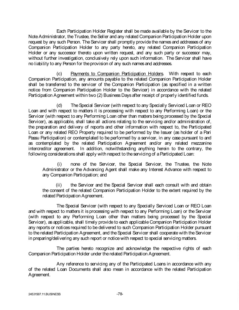 Each Participation Holder Register shall be made available by the Servicer to the Note Administrator, the Trustee, the Seller and any related Companion Participation Holder upon request by any such Person. The Servicer shall promptly provide the names and addresses of any Companion Participation Holder to any party hereto, any related Companion Participation Holder or any successor thereto upon written request, and any such party or successor may, without further investigation, conclusively rely upon such information. The Servicer shall have no liability to any Person for the provision of any such names and addresses. (c) Payments to Companion Participation Holders. With respect to each Companion Participation, any amounts payable to the related Companion Participation Holder shall be transferred to the servicer of the Companion Participation (as specified in a written notice from Companion Participation Holder to the Servicer) in accordance with the related Participation Agreement within two (2) Business Days after receipt of properly identified funds. (d) The Special Servicer (with respect to any Specially Serviced Loan or REO Loan and with respect to matters it is processing with respect to any Performing Loan) or the Servicer (with respect to any Performing Loan other than matters being processed by the Special Servicer), as applicable, shall take all actions relating to the servicing and/or administration of, the preparation and delivery of reports and other information with respect to, the Participated Loan or any related REO Property required to be performed by the Issuer (as holder of a Pari Passu Participation) or contemplated to be performed by a servicer, in any case pursuant to and as contemplated by the related Participation Agreement and/or any related mezzanine intercreditor agreement. In addition, notwithstanding anything herein to the contrary, the following considerations shall apply with respect to the servicing of a Participated Loan: (i) none of the Servicer, the Special Servicer, the Trustee, the Note Administrator or the Advancing Agent shall make any Interest Advance with respect to any Companion Participation; and (ii) the Servicer and the Special Servicer shall each consult with and obtain the consent of the related Companion Participation Holder to the extent required by the related Participation Agreement. The Special Servicer (with respect to any Specially Serviced Loan or REO Loan and with respect to matters it is processing with respect to any Performing Loan) or the Servicer (with respect to any Performing Loan other than matters being processed by the Special Servicer), as applicable, shall timely provide to each applicable Companion Participation Holder any reports or notices required to be delivered to such Companion Participation Holder pursuant to the related Participation Agreement, and the Special Servicer shall cooperate with the Servicer in preparing/delivering any such report or notice with respect to special servicing matters. The parties hereto recognize and acknowledge the respective rights of each Companion Participation Holder under the related Participation Agreement. Any reference to servicing any of the Participated Loans in accordance with any of the related Loan Documents shall also mean in accordance with the related Participation Agreement. 24531587.11.BUSINESS -78-