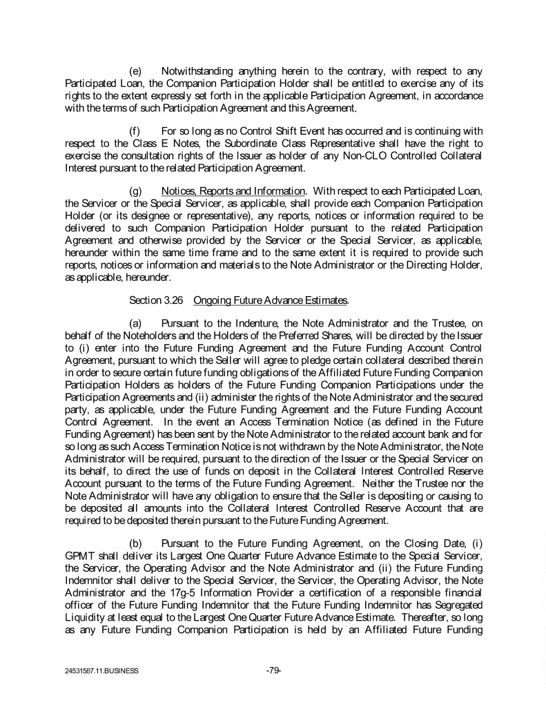 (e) Notwithstanding anything herein to the contrary, with respect to any Participated Loan, the Companion Participation Holder shall be entitled to exercise any of its rights to the extent expressly set forth in the applicable Participation Agreement, in accordance with the terms of such Participation Agreement and this Agreement. (f) For so long as no Control Shift Event has occurred and is continuing with respect to the Class E Notes, the Subordinate Class Representative shall have the right to exercise the consultation rights of the Issuer as holder of any Non-CLO Controlled Collateral Interest pursuant to the related Participation Agreement. (g) Notices, Reports and Information. With respect to each Participated Loan, the Servicer or the Special Servicer, as applicable, shall provide each Companion Participation Holder (or its designee or representative), any reports, notices or information required to be delivered to such Companion Participation Holder pursuant to the related Participation Agreement and otherwise provided by the Servicer or the Special Servicer, as applicable, hereunder within the same time frame and to the same extent it is required to provide such reports, notices or information and materials to the Note Administrator or the Directing Holder, as applicable, hereunder. Section 3.26 Ongoing Future Advance Estimates. (a) Pursuant to the Indenture, the Note Administrator and the Trustee, on behalf of the Noteholders and the Holders of the Preferred Shares, will be directed by the Issuer to (i) enter into the Future Funding Agreement and the Future Funding Account Control Agreement, pursuant to which the Seller will agree to pledge certain collateral described therein in order to secure certain future funding obligations of the Affiliated Future Funding Companion Participation Holders as holders of the Future Funding Companion Participations under the Participation Agreements and (ii) administer the rights of the Note Administrator and the secured party, as applicable, under the Future Funding Agreement and the Future Funding Account Control Agreement. In the event an Access Termination Notice (as defined in the Future Funding Agreement) has been sent by the Note Administrator to the related account bank and for so long as such Access Termination Notice is not withdrawn by the Note Administrator, the Note Administrator will be required, pursuant to the direction of the Issuer or the Special Servicer on its behalf, to direct the use of funds on deposit in the Collateral Interest Controlled Reserve Account pursuant to the terms of the Future Funding Agreement. Neither the Trustee nor the Note Administrator will have any obligation to ensure that the Seller is depositing or causing to be deposited all amounts into the Collateral Interest Controlled Reserve Account that are required to be deposited therein pursuant to the Future Funding Agreement. (b) Pursuant to the Future Funding Agreement, on the Closing Date, (i) GPMT shall deliver its Largest One Quarter Future Advance Estimate to the Special Servicer, the Servicer, the Operating Advisor and the Note Administrator and (ii) the Future Funding Indemnitor shall deliver to the Special Servicer, the Servicer, the Operating Advisor, the Note Administrator and the 17g-5 Information Provider a certification of a responsible financial officer of the Future Funding Indemnitor that the Future Funding Indemnitor has Segregated Liquidity at least equal to the Largest One Quarter Future Advance Estimate. Thereafter, so long as any Future Funding Companion Participation is held by an Affiliated Future Funding 24531587.11.BUSINESS -79-