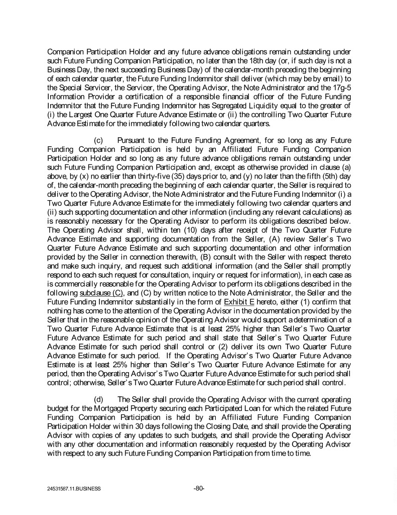 Companion Participation Holder and any future advance obligations remain outstanding under such Future Funding Companion Participation, no later than the 18th day (or, if such day is not a Business Day, the next succeeding Business Day) of the calendar-month preceding the beginning of each calendar quarter, the Future Funding Indemnitor shall deliver (which may be by email) to the Special Servicer, the Servicer, the Operating Advisor, the Note Administrator and the 17g-5 Information Provider a certification of a responsible financial officer of the Future Funding Indemnitor that the Future Funding Indemnitor has Segregated Liquidity equal to the greater of (i) the Largest One Quarter Future Advance Estimate or (ii) the controlling Two Quarter Future Advance Estimate for the immediately following two calendar quarters. (c) Pursuant to the Future Funding Agreement, for so long as any Future Funding Companion Participation is held by an Affiliated Future Funding Companion Participation Holder and so long as any future advance obligations remain outstanding under such Future Funding Companion Participation and, except as otherwise provided in clause (a) above, by (x) no earlier than thirty-five (35) days prior to, and (y) no later than the fifth (5th) day of, the calendar-month preceding the beginning of each calendar quarter, the Seller is required to deliver to the Operating Advisor, the Note Administrator and the Future Funding Indemnitor (i) a Two Quarter Future Advance Estimate for the immediately following two calendar quarters and (ii) such supporting documentation and other information (including any relevant calculations) as is reasonably necessary for the Operating Advisor to perform its obligations described below. The Operating Advisor shall, within ten (10) days after receipt of the Two Quarter Future Advance Estimate and supporting documentation from the Seller, (A) review Seller’s Two Quarter Future Advance Estimate and such supporting documentation and other information provided by the Seller in connection therewith, (B) consult with the Seller with respect thereto and make such inquiry, and request such additional information (and the Seller shall promptly respond to each such request for consultation, inquiry or request for information), in each case as is commercially reasonable for the Operating Advisor to perform its obligations described in the following subclause (C), and (C) by written notice to the Note Administrator, the Seller and the Future Funding Indemnitor substantially in the form of Exhibit E hereto, either (1) confirm that nothing has come to the attention of the Operating Advisor in the documentation provided by the Seller that in the reasonable opinion of the Operating Advisor would support a determination of a Two Quarter Future Advance Estimate that is at least 25% higher than Seller’s Two Quarter Future Advance Estimate for such period and shall state that Seller’s Two Quarter Future Advance Estimate for such period shall control or (2) deliver its own Two Quarter Future Advance Estimate for such period. If the Operating Advisor’s Two Quarter Future Advance Estimate is at least 25% higher than Seller’s Two Quarter Future Advance Estimate for any period, then the Operating Advisor’s Two Quarter Future Advance Estimate for such period shall control; otherwise, Seller’s Two Quarter Future Advance Estimate for such period shall control. (d) The Seller shall provide the Operating Advisor with the current operating budget for the Mortgaged Property securing each Participated Loan for which the related Future Funding Companion Participation is held by an Affiliated Future Funding Companion Participation Holder within 30 days following the Closing Date, and shall provide the Operating Advisor with copies of any updates to such budgets, and shall provide the Operating Advisor with any other documentation and information reasonably requested by the Operating Advisor with respect to any such Future Funding Companion Participation from time to time. 24531587.11.BUSINESS -80-