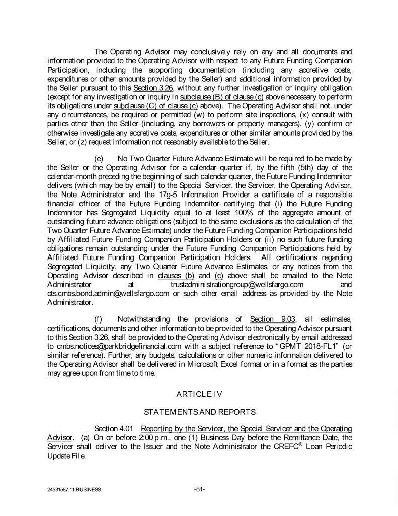 The Operating Advisor may conclusively rely on any and all documents and information provided to the Operating Advisor with respect to any Future Funding Companion Participation, including the supporting documentation (including any accretive costs, expenditures or other amounts provided by the Seller) and additional information provided by the Seller pursuant to this Section 3.26, without any further investigation or inquiry obligation (except for any investigation or inquiry in subclause (B) of clause (c) above necessary to perform its obligations under subclause (C) of clause (c) above). The Operating Advisor shall not, under any circumstances, be required or permitted (w) to perform site inspections, (x) consult with parties other than the Seller (including, any borrowers or property managers), (y) confirm or otherwise investigate any accretive costs, expenditures or other similar amounts provided by the Seller, or (z) request information not reasonably available to the Seller. (e) No Two Quarter Future Advance Estimate will be required to be made by the Seller or the Operating Advisor for a calendar quarter if, by the fifth (5th) day of the calendar-month preceding the beginning of such calendar quarter, the Future Funding Indemnitor delivers (which may be by email) to the Special Servicer, the Servicer, the Operating Advisor, the Note Administrator and the 17g-5 Information Provider a certificate of a responsible financial officer of the Future Funding Indemnitor certifying that (i) the Future Funding Indemnitor has Segregated Liquidity equal to at least 100% of the aggregate amount of outstanding future advance obligations (subject to the same exclusions as the calculation of the Two Quarter Future Advance Estimate) under the Future Funding Companion Participations held by Affiliated Future Funding Companion Participation Holders or (ii) no such future funding obligations remain outstanding under the Future Funding Companion Participations held by Affiliated Future Funding Companion Participation Holders. All certifications regarding Segregated Liquidity, any Two Quarter Future Advance Estimates, or any notices from the Operating Advisor described in clauses (b) and (c) above shall be emailed to the Note Administrator at trustadministrationgroup@wellsfargo.com and cts.cmbs.bond.admin@wellsfargo.com or such other email address as provided by the Note Administrator. (f) Notwithstanding the provisions of Section 9.03, all estimates, certifications, documents and other information to be provided to the Operating Advisor pursuant to this Section 3.26, shall be provided to the Operating Advisor electronically by email addressed to cmbs.notices@parkbridgefinancial.com with a subject reference to “GPMT 2018-FL1” (or similar reference). Further, any budgets, calculations or other numeric information delivered to the Operating Advisor shall be delivered in Microsoft Excel format or in a format as the parties may agree upon from time to time. ARTICLE IV STATEMENTS AND REPORTS Section 4.01 Reporting by the Servicer, the Special Servicer and the Operating Advisor. (a) On or before 2:00 p.m., one (1) Business Day before the Remittance Date, the Servicer shall deliver to the Issuer and the Note Administrator the CREFC® Loan Periodic Update File. 24531587.11.BUSINESS -81-