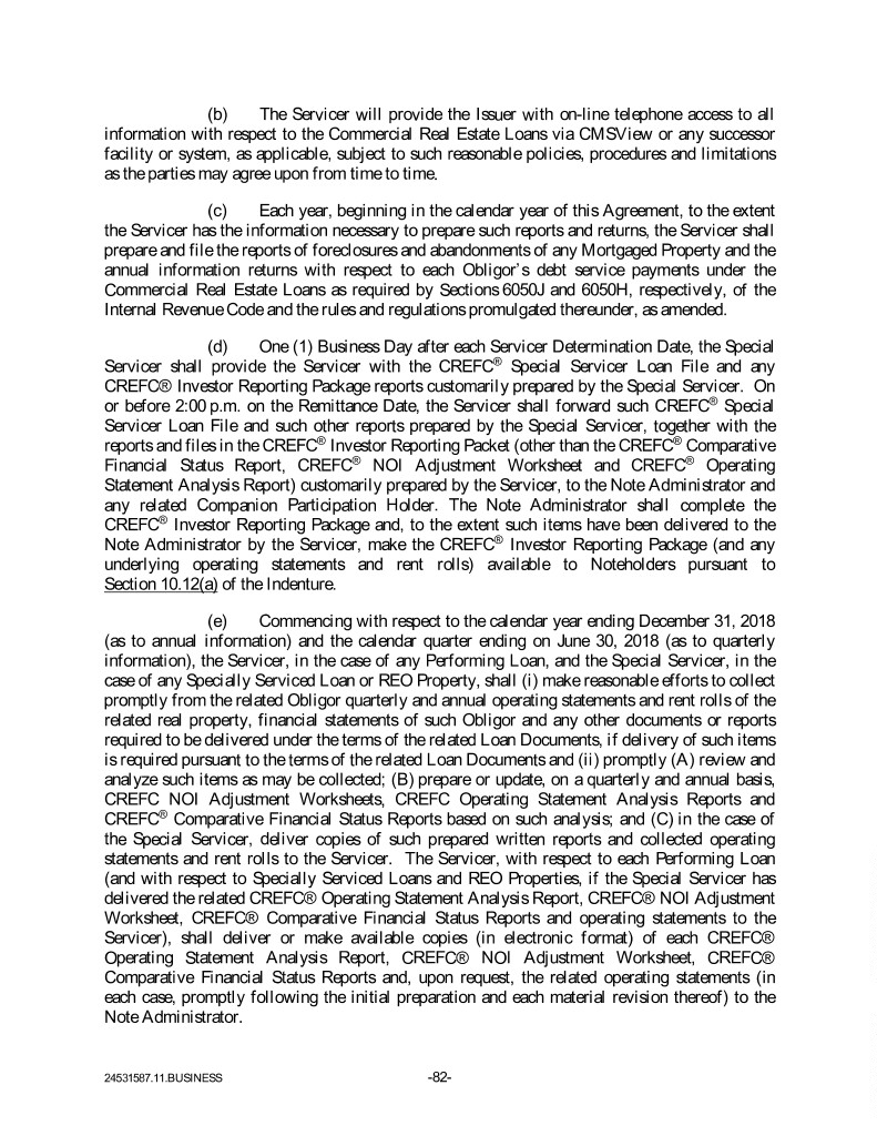 (b) The Servicer will provide the Issuer with on-line telephone access to all information with respect to the Commercial Real Estate Loans via CMSView or any successor facility or system, as applicable, subject to such reasonable policies, procedures and limitations as the parties may agree upon from time to time. (c) Each year, beginning in the calendar year of this Agreement, to the extent the Servicer has the information necessary to prepare such reports and returns, the Servicer shall prepare and file the reports of foreclosures and abandonments of any Mortgaged Property and the annual information returns with respect to each Obligor’s debt service payments under the Commercial Real Estate Loans as required by Sections 6050J and 6050H, respectively, of the Internal Revenue Code and the rules and regulations promulgated thereunder, as amended. (d) One (1) Business Day after each Servicer Determination Date, the Special Servicer shall provide the Servicer with the CREFC® Special Servicer Loan File and any CREFC® Investor Reporting Package reports customarily prepared by the Special Servicer. On or before 2:00 p.m. on the Remittance Date, the Servicer shall forward such CREFC® Special Servicer Loan File and such other reports prepared by the Special Servicer, together with the reports and files in the CREFC® Investor Reporting Packet (other than the CREFC® Comparative Financial Status Report, CREFC® NOI Adjustment Worksheet and CREFC® Operating Statement Analysis Report) customarily prepared by the Servicer, to the Note Administrator and any related Companion Participation Holder. The Note Administrator shall complete the CREFC® Investor Reporting Package and, to the extent such items have been delivered to the Note Administrator by the Servicer, make the CREFC® Investor Reporting Package (and any underlying operating statements and rent rolls) available to Noteholders pursuant to Section 10.12(a) of the Indenture. (e) Commencing with respect to the calendar year ending December 31, 2018 (as to annual information) and the calendar quarter ending on June 30, 2018 (as to quarterly information), the Servicer, in the case of any Performing Loan, and the Special Servicer, in the case of any Specially Serviced Loan or REO Property, shall (i) make reasonable efforts to collect promptly from the related Obligor quarterly and annual operating statements and rent rolls of the related real property, financial statements of such Obligor and any other documents or reports required to be delivered under the terms of the related Loan Documents, if delivery of such items is required pursuant to the terms of the related Loan Documents and (ii) promptly (A) review and analyze such items as may be collected; (B) prepare or update, on a quarterly and annual basis, CREFC NOI Adjustment Worksheets, CREFC Operating Statement Analysis Reports and CREFC® Comparative Financial Status Reports based on such analysis; and (C) in the case of the Special Servicer, deliver copies of such prepared written reports and collected operating statements and rent rolls to the Servicer. The Servicer, with respect to each Performing Loan (and with respect to Specially Serviced Loans and REO Properties, if the Special Servicer has delivered the related CREFC® Operating Statement Analysis Report, CREFC® NOI Adjustment Worksheet, CREFC® Comparative Financial Status Reports and operating statements to the Servicer), shall deliver or make available copies (in electronic format) of each CREFC® Operating Statement Analysis Report, CREFC® NOI Adjustment Worksheet, CREFC® Comparative Financial Status Reports and, upon request, the related operating statements (in each case, promptly following the initial preparation and each material revision thereof) to the Note Administrator. 24531587.11.BUSINESS -82-