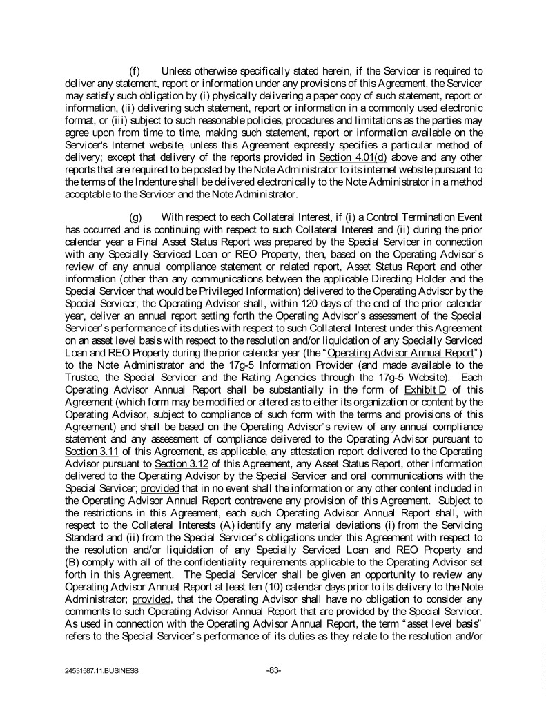 (f) Unless otherwise specifically stated herein, if the Servicer is required to deliver any statement, report or information under any provisions of this Agreement, the Servicer may satisfy such obligation by (i) physically delivering a paper copy of such statement, report or information, (ii) delivering such statement, report or information in a commonly used electronic format, or (iii) subject to such reasonable policies, procedures and limitations as the parties may agree upon from time to time, making such statement, report or information available on the Servicer's Internet website, unless this Agreement expressly specifies a particular method of delivery; except that delivery of the reports provided in Section 4.01(d) above and any other reports that are required to be posted by the Note Administrator to its internet website pursuant to the terms of the Indenture shall be delivered electronically to the Note Administrator in a method acceptable to the Servicer and the Note Administrator. (g) With respect to each Collateral Interest, if (i) a Control Termination Event has occurred and is continuing with respect to such Collateral Interest and (ii) during the prior calendar year a Final Asset Status Report was prepared by the Special Servicer in connection with any Specially Serviced Loan or REO Property, then, based on the Operating Advisor’s review of any annual compliance statement or related report, Asset Status Report and other information (other than any communications between the applicable Directing Holder and the Special Servicer that would be Privileged Information) delivered to the Operating Advisor by the Special Servicer, the Operating Advisor shall, within 120 days of the end of the prior calendar year, deliver an annual report setting forth the Operating Advisor’s assessment of the Special Servicer’s performance of its duties with respect to such Collateral Interest under this Agreement on an asset level basis with respect to the resolution and/or liquidation of any Specially Serviced Loan and REO Property during the prior calendar year (the “Operating Advisor Annual Report”) to the Note Administrator and the 17g-5 Information Provider (and made available to the Trustee, the Special Servicer and the Rating Agencies through the 17g-5 Website). Each Operating Advisor Annual Report shall be substantially in the form of Exhibit D of this Agreement (which form may be modified or altered as to either its organization or content by the Operating Advisor, subject to compliance of such form with the terms and provisions of this Agreement) and shall be based on the Operating Advisor’s review of any annual compliance statement and any assessment of compliance delivered to the Operating Advisor pursuant to Section 3.11 of this Agreement, as applicable, any attestation report delivered to the Operating Advisor pursuant to Section 3.12 of this Agreement, any Asset Status Report, other information delivered to the Operating Advisor by the Special Servicer and oral communications with the Special Servicer; provided that in no event shall the information or any other content included in the Operating Advisor Annual Report contravene any provision of this Agreement. Subject to the restrictions in this Agreement, each such Operating Advisor Annual Report shall, with respect to the Collateral Interests (A) identify any material deviations (i) from the Servicing Standard and (ii) from the Special Servicer’s obligations under this Agreement with respect to the resolution and/or liquidation of any Specially Serviced Loan and REO Property and (B) comply with all of the confidentiality requirements applicable to the Operating Advisor set forth in this Agreement. The Special Servicer shall be given an opportunity to review any Operating Advisor Annual Report at least ten (10) calendar days prior to its delivery to the Note Administrator; provided, that the Operating Advisor shall have no obligation to consider any comments to such Operating Advisor Annual Report that are provided by the Special Servicer. As used in connection with the Operating Advisor Annual Report, the term “asset level basis” refers to the Special Servicer’s performance of its duties as they relate to the resolution and/or 24531587.11.BUSINESS -83-