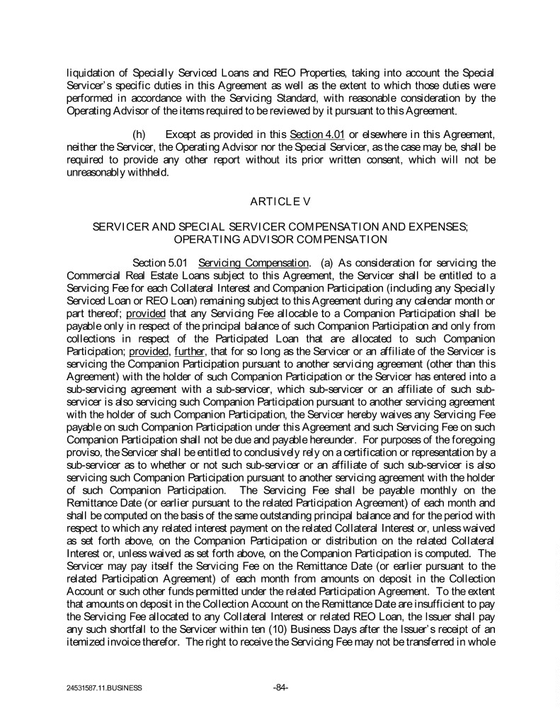 liquidation of Specially Serviced Loans and REO Properties, taking into account the Special Servicer’s specific duties in this Agreement as well as the extent to which those duties were performed in accordance with the Servicing Standard, with reasonable consideration by the Operating Advisor of the items required to be reviewed by it pursuant to this Agreement. (h) Except as provided in this Section 4.01 or elsewhere in this Agreement, neither the Servicer, the Operating Advisor nor the Special Servicer, as the case may be, shall be required to provide any other report without its prior written consent, which will not be unreasonably withheld. ARTICLE V SERVICER AND SPECIAL SERVICER COMPENSATION AND EXPENSES; OPERATING ADVISOR COMPENSATION Section 5.01 Servicing Compensation. (a) As consideration for servicing the Commercial Real Estate Loans subject to this Agreement, the Servicer shall be entitled to a Servicing Fee for each Collateral Interest and Companion Participation (including any Specially Serviced Loan or REO Loan) remaining subject to this Agreement during any calendar month or part thereof; provided that any Servicing Fee allocable to a Companion Participation shall be payable only in respect of the principal balance of such Companion Participation and only from collections in respect of the Participated Loan that are allocated to such Companion Participation; provided, further, that for so long as the Servicer or an affiliate of the Servicer is servicing the Companion Participation pursuant to another servicing agreement (other than this Agreement) with the holder of such Companion Participation or the Servicer has entered into a sub-servicing agreement with a sub-servicer, which sub-servicer or an affiliate of such sub- servicer is also servicing such Companion Participation pursuant to another servicing agreement with the holder of such Companion Participation, the Servicer hereby waives any Servicing Fee payable on such Companion Participation under this Agreement and such Servicing Fee on such Companion Participation shall not be due and payable hereunder. For purposes of the foregoing proviso, the Servicer shall be entitled to conclusively rely on a certification or representation by a sub-servicer as to whether or not such sub-servicer or an affiliate of such sub-servicer is also servicing such Companion Participation pursuant to another servicing agreement with the holder of such Companion Participation. The Servicing Fee shall be payable monthly on the Remittance Date (or earlier pursuant to the related Participation Agreement) of each month and shall be computed on the basis of the same outstanding principal balance and for the period with respect to which any related interest payment on the related Collateral Interest or, unless waived as set forth above, on the Companion Participation or distribution on the related Collateral Interest or, unless waived as set forth above, on the Companion Participation is computed. The Servicer may pay itself the Servicing Fee on the Remittance Date (or earlier pursuant to the related Participation Agreement) of each month from amounts on deposit in the Collection Account or such other funds permitted under the related Participation Agreement. To the extent that amounts on deposit in the Collection Account on the Remittance Date are insufficient to pay the Servicing Fee allocated to any Collateral Interest or related REO Loan, the Issuer shall pay any such shortfall to the Servicer within ten (10) Business Days after the Issuer’s receipt of an itemized invoice therefor. The right to receive the Servicing Fee may not be transferred in whole 24531587.11.BUSINESS -84-