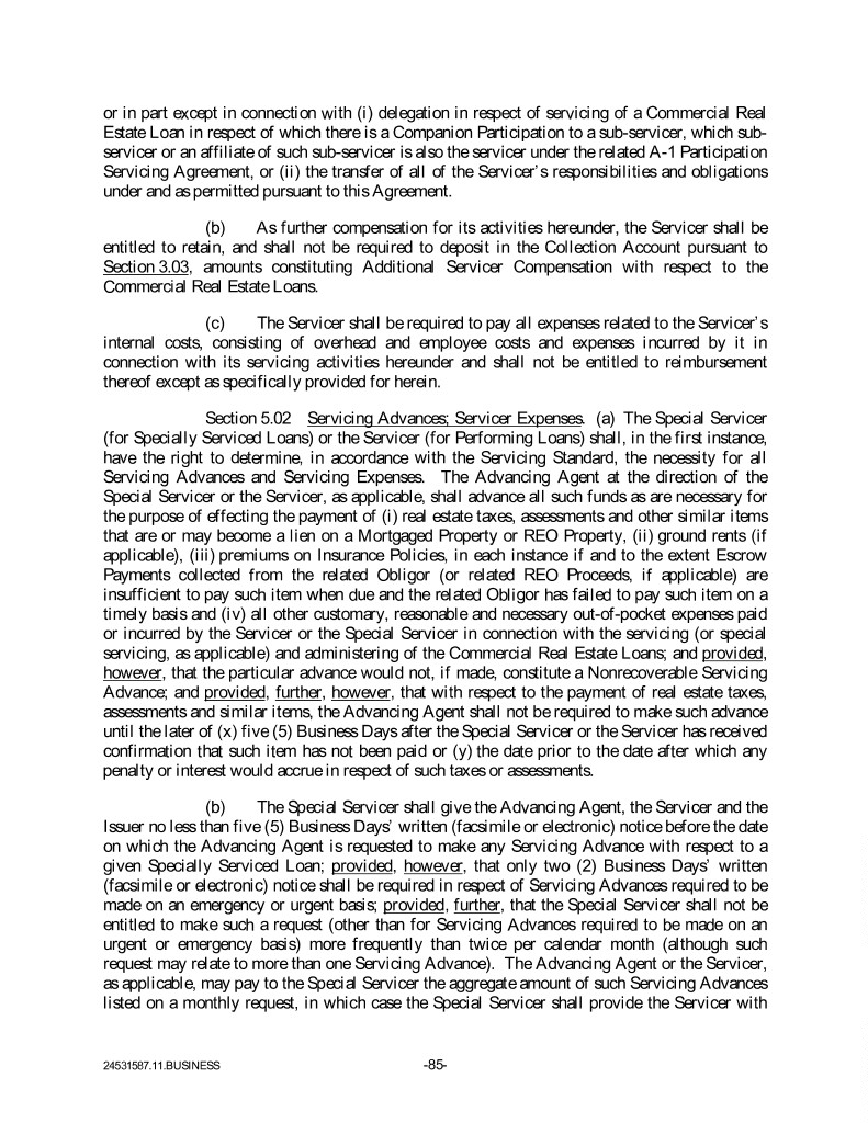 or in part except in connection with (i) delegation in respect of servicing of a Commercial Real Estate Loan in respect of which there is a Companion Participation to a sub-servicer, which sub- servicer or an affiliate of such sub-servicer is also the servicer under the related A-1 Participation Servicing Agreement, or (ii) the transfer of all of the Servicer’s responsibilities and obligations under and as permitted pursuant to this Agreement. (b) As further compensation for its activities hereunder, the Servicer shall be entitled to retain, and shall not be required to deposit in the Collection Account pursuant to Section 3.03, amounts constituting Additional Servicer Compensation with respect to the Commercial Real Estate Loans. (c) The Servicer shall be required to pay all expenses related to the Servicer’s internal costs, consisting of overhead and employee costs and expenses incurred by it in connection with its servicing activities hereunder and shall not be entitled to reimbursement thereof except as specifically provided for herein. Section 5.02 Servicing Advances; Servicer Expenses. (a) The Special Servicer (for Specially Serviced Loans) or the Servicer (for Performing Loans) shall, in the first instance, have the right to determine, in accordance with the Servicing Standard, the necessity for all Servicing Advances and Servicing Expenses. The Advancing Agent at the direction of the Special Servicer or the Servicer, as applicable, shall advance all such funds as are necessary for the purpose of effecting the payment of (i) real estate taxes, assessments and other similar items that are or may become a lien on a Mortgaged Property or REO Property, (ii) ground rents (if applicable), (iii) premiums on Insurance Policies, in each instance if and to the extent Escrow Payments collected from the related Obligor (or related REO Proceeds, if applicable) are insufficient to pay such item when due and the related Obligor has failed to pay such item on a timely basis and (iv) all other customary, reasonable and necessary out-of-pocket expenses paid or incurred by the Servicer or the Special Servicer in connection with the servicing (or special servicing, as applicable) and administering of the Commercial Real Estate Loans; and provided, however, that the particular advance would not, if made, constitute a Nonrecoverable Servicing Advance; and provided, further, however, that with respect to the payment of real estate taxes, assessments and similar items, the Advancing Agent shall not be required to make such advance until the later of (x) five (5) Business Days after the Special Servicer or the Servicer has received confirmation that such item has not been paid or (y) the date prior to the date after which any penalty or interest would accrue in respect of such taxes or assessments. (b) The Special Servicer shall give the Advancing Agent, the Servicer and the Issuer no less than five (5) Business Days’ written (facsimile or electronic) notice before the date on which the Advancing Agent is requested to make any Servicing Advance with respect to a given Specially Serviced Loan; provided, however, that only two (2) Business Days’ written (facsimile or electronic) notice shall be required in respect of Servicing Advances required to be made on an emergency or urgent basis; provided, further, that the Special Servicer shall not be entitled to make such a request (other than for Servicing Advances required to be made on an urgent or emergency basis) more frequently than twice per calendar month (although such request may relate to more than one Servicing Advance). The Advancing Agent or the Servicer, as applicable, may pay to the Special Servicer the aggregate amount of such Servicing Advances listed on a monthly request, in which case the Special Servicer shall provide the Servicer with 24531587.11.BUSINESS -85-