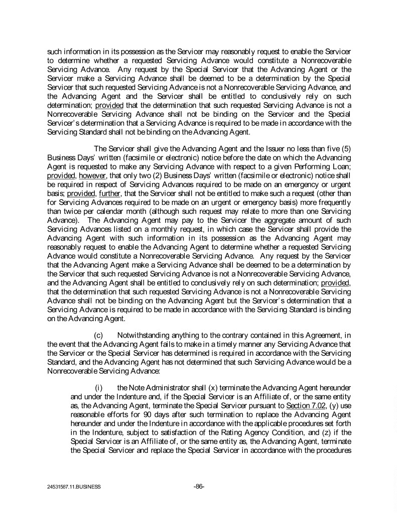 such information in its possession as the Servicer may reasonably request to enable the Servicer to determine whether a requested Servicing Advance would constitute a Nonrecoverable Servicing Advance. Any request by the Special Servicer that the Advancing Agent or the Servicer make a Servicing Advance shall be deemed to be a determination by the Special Servicer that such requested Servicing Advance is not a Nonrecoverable Servicing Advance, and the Advancing Agent and the Servicer shall be entitled to conclusively rely on such determination; provided that the determination that such requested Servicing Advance is not a Nonrecoverable Servicing Advance shall not be binding on the Servicer and the Special Servicer’s determination that a Servicing Advance is required to be made in accordance with the Servicing Standard shall not be binding on the Advancing Agent. The Servicer shall give the Advancing Agent and the Issuer no less than five (5) Business Days’ written (facsimile or electronic) notice before the date on which the Advancing Agent is requested to make any Servicing Advance with respect to a given Performing Loan; provided, however, that only two (2) Business Days’ written (facsimile or electronic) notice shall be required in respect of Servicing Advances required to be made on an emergency or urgent basis; provided, further, that the Servicer shall not be entitled to make such a request (other than for Servicing Advances required to be made on an urgent or emergency basis) more frequently than twice per calendar month (although such request may relate to more than one Servicing Advance). The Advancing Agent may pay to the Servicer the aggregate amount of such Servicing Advances listed on a monthly request, in which case the Servicer shall provide the Advancing Agent with such information in its possession as the Advancing Agent may reasonably request to enable the Advancing Agent to determine whether a requested Servicing Advance would constitute a Nonrecoverable Servicing Advance. Any request by the Servicer that the Advancing Agent make a Servicing Advance shall be deemed to be a determination by the Servicer that such requested Servicing Advance is not a Nonrecoverable Servicing Advance, and the Advancing Agent shall be entitled to conclusively rely on such determination; provided, that the determination that such requested Servicing Advance is not a Nonrecoverable Servicing Advance shall not be binding on the Advancing Agent but the Servicer’s determination that a Servicing Advance is required to be made in accordance with the Servicing Standard is binding on the Advancing Agent. (c) Notwithstanding anything to the contrary contained in this Agreement, in the event that the Advancing Agent fails to make in a timely manner any Servicing Advance that the Servicer or the Special Servicer has determined is required in accordance with the Servicing Standard, and the Advancing Agent has not determined that such Servicing Advance would be a Nonrecoverable Servicing Advance: (i) the Note Administrator shall (x) terminate the Advancing Agent hereunder and under the Indenture and, if the Special Servicer is an Affiliate of, or the same entity as, the Advancing Agent, terminate the Special Servicer pursuant to Section 7.02, (y) use reasonable efforts for 90 days after such termination to replace the Advancing Agent hereunder and under the Indenture in accordance with the applicable procedures set forth in the Indenture, subject to satisfaction of the Rating Agency Condition, and (z) if the Special Servicer is an Affiliate of, or the same entity as, the Advancing Agent, terminate the Special Servicer and replace the Special Servicer in accordance with the procedures 24531587.11.BUSINESS -86-