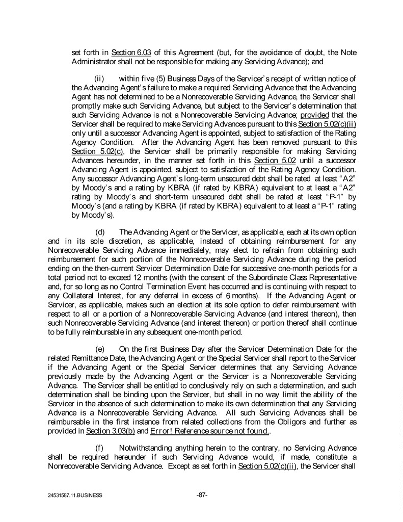 set forth in Section 6.03 of this Agreement (but, for the avoidance of doubt, the Note Administrator shall not be responsible for making any Servicing Advance); and (ii) within five (5) Business Days of the Servicer’s receipt of written notice of the Advancing Agent’s failure to make a required Servicing Advance that the Advancing Agent has not determined to be a Nonrecoverable Servicing Advance, the Servicer shall promptly make such Servicing Advance, but subject to the Servicer’s determination that such Servicing Advance is not a Nonrecoverable Servicing Advance; provided that the Servicer shall be required to make Servicing Advances pursuant to this Section 5.02(c)(ii) only until a successor Advancing Agent is appointed, subject to satisfaction of the Rating Agency Condition. After the Advancing Agent has been removed pursuant to this Section 5.02(c), the Servicer shall be primarily responsible for making Servicing Advances hereunder, in the manner set forth in this Section 5.02 until a successor Advancing Agent is appointed, subject to satisfaction of the Rating Agency Condition. Any successor Advancing Agent’s long-term unsecured debt shall be rated at least “A2” by Moody’s and a rating by KBRA (if rated by KBRA) equivalent to at least a “A2” rating by Moody’s and short-term unsecured debt shall be rated at least “P-1” by Moody’s (and a rating by KBRA (if rated by KBRA) equivalent to at least a “P-1” rating by Moody’s). (d) The Advancing Agent or the Servicer, as applicable, each at its own option and in its sole discretion, as applicable, instead of obtaining reimbursement for any Nonrecoverable Servicing Advance immediately, may elect to refrain from obtaining such reimbursement for such portion of the Nonrecoverable Servicing Advance during the period ending on the then-current Servicer Determination Date for successive one-month periods for a total period not to exceed 12 months (with the consent of the Subordinate Class Representative and, for so long as no Control Termination Event has occurred and is continuing with respect to any Collateral Interest, for any deferral in excess of 6 months). If the Advancing Agent or Servicer, as applicable, makes such an election at its sole option to defer reimbursement with respect to all or a portion of a Nonrecoverable Servicing Advance (and interest thereon), then such Nonrecoverable Servicing Advance (and interest thereon) or portion thereof shall continue to be fully reimbursable in any subsequent one-month period. (e) On the first Business Day after the Servicer Determination Date for the related Remittance Date, the Advancing Agent or the Special Servicer shall report to the Servicer if the Advancing Agent or the Special Servicer determines that any Servicing Advance previously made by the Advancing Agent or the Servicer is a Nonrecoverable Servicing Advance. The Servicer shall be entitled to conclusively rely on such a determination, and such determination shall be binding upon the Servicer, but shall in no way limit the ability of the Servicer in the absence of such determination to make its own determination that any Servicing Advance is a Nonrecoverable Servicing Advance. All such Servicing Advances shall be reimbursable in the first instance from related collections from the Obligors and further as provided in Section 3.03(b) and Error! Reference source not found.. (f) Notwithstanding anything herein to the contrary, no Servicing Advance shall be required hereunder if such Servicing Advance would, if made, constitute a Nonrecoverable Servicing Advance. Except as set forth in Section 5.02(c)(ii), the Servicer shall 24531587.11.BUSINESS -87-