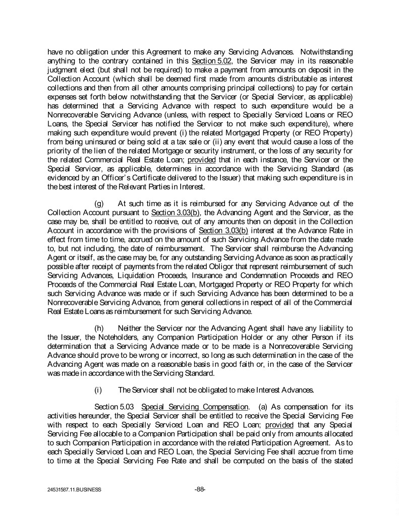 have no obligation under this Agreement to make any Servicing Advances. Notwithstanding anything to the contrary contained in this Section 5.02, the Servicer may in its reasonable judgment elect (but shall not be required) to make a payment from amounts on deposit in the Collection Account (which shall be deemed first made from amounts distributable as interest collections and then from all other amounts comprising principal collections) to pay for certain expenses set forth below notwithstanding that the Servicer (or Special Servicer, as applicable) has determined that a Servicing Advance with respect to such expenditure would be a Nonrecoverable Servicing Advance (unless, with respect to Specially Serviced Loans or REO Loans, the Special Servicer has notified the Servicer to not make such expenditure), where making such expenditure would prevent (i) the related Mortgaged Property (or REO Property) from being uninsured or being sold at a tax sale or (ii) any event that would cause a loss of the priority of the lien of the related Mortgage or security instrument, or the loss of any security for the related Commercial Real Estate Loan; provided that in each instance, the Servicer or the Special Servicer, as applicable, determines in accordance with the Servicing Standard (as evidenced by an Officer’s Certificate delivered to the Issuer) that making such expenditure is in the best interest of the Relevant Parties in Interest. (g) At such time as it is reimbursed for any Servicing Advance out of the Collection Account pursuant to Section 3.03(b), the Advancing Agent and the Servicer, as the case may be, shall be entitled to receive, out of any amounts then on deposit in the Collection Account in accordance with the provisions of Section 3.03(b) interest at the Advance Rate in effect from time to time, accrued on the amount of such Servicing Advance from the date made to, but not including, the date of reimbursement. The Servicer shall reimburse the Advancing Agent or itself, as the case may be, for any outstanding Servicing Advance as soon as practically possible after receipt of payments from the related Obligor that represent reimbursement of such Servicing Advances, Liquidation Proceeds, Insurance and Condemnation Proceeds and REO Proceeds of the Commercial Real Estate Loan, Mortgaged Property or REO Property for which such Servicing Advance was made or if such Servicing Advance has been determined to be a Nonrecoverable Servicing Advance, from general collections in respect of all of the Commercial Real Estate Loans as reimbursement for such Servicing Advance. (h) Neither the Servicer nor the Advancing Agent shall have any liability to the Issuer, the Noteholders, any Companion Participation Holder or any other Person if its determination that a Servicing Advance made or to be made is a Nonrecoverable Servicing Advance should prove to be wrong or incorrect, so long as such determination in the case of the Advancing Agent was made on a reasonable basis in good faith or, in the case of the Servicer was made in accordance with the Servicing Standard. (i) The Servicer shall not be obligated to make Interest Advances. Section 5.03 Special Servicing Compensation. (a) As compensation for its activities hereunder, the Special Servicer shall be entitled to receive the Special Servicing Fee with respect to each Specially Serviced Loan and REO Loan; provided that any Special Servicing Fee allocable to a Companion Participation shall be paid only from amounts allocated to such Companion Participation in accordance with the related Participation Agreement. As to each Specially Serviced Loan and REO Loan, the Special Servicing Fee shall accrue from time to time at the Special Servicing Fee Rate and shall be computed on the basis of the stated 24531587.11.BUSINESS -88-