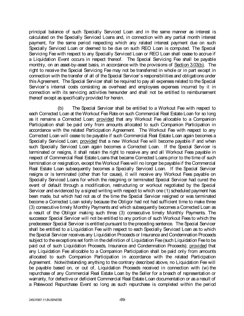 principal balance of such Specially Serviced Loan and in the same manner as interest is calculated on the Specially Serviced Loans and, in connection with any partial month interest payment, for the same period respecting which any related interest payment due on such Specially Serviced Loan or deemed to be due on such REO Loan is computed. The Special Servicing Fee with respect to any Specially Serviced Loan or REO Loan shall cease to accrue if a Liquidation Event occurs in respect thereof. The Special Servicing Fee shall be payable monthly, on an asset-by-asset basis, in accordance with the provisions of Section 3.03(b). The right to receive the Special Servicing Fee may not be transferred in whole or in part except in connection with the transfer of all of the Special Servicer’s responsibilities and obligations under this Agreement. The Special Servicer shall be required to pay all expenses related to the Special Servicer’s internal costs consisting as overhead and employees expenses incurred by it in connection with its servicing activities hereunder and shall not be entitled to reimbursement thereof except as specifically provided for herein. (b) The Special Servicer shall be entitled to a Workout Fee with respect to each Corrected Loan at the Workout Fee Rate on such Commercial Real Estate Loan for so long as it remains a Corrected Loan; provided that any Workout Fee allocable to a Companion Participation shall be paid only from amounts allocated to such Companion Participation in accordance with the related Participation Agreement. The Workout Fee with respect to any Corrected Loan will cease to be payable if such Commercial Real Estate Loan again becomes a Specially Serviced Loan; provided that a new Workout Fee will become payable if and when such Specially Serviced Loan again becomes a Corrected Loan. If the Special Servicer is terminated or resigns, it shall retain the right to receive any and all Workout Fees payable in respect of Commercial Real Estate Loans that became Corrected Loans prior to the time of such termination or resignation, except the Workout Fees will no longer be payable if the Commercial Real Estate Loan subsequently becomes a Specially Serviced Loan. If the Special Servicer resigns or is terminated (other than for cause), it will receive any Workout Fees payable on Specially Serviced Loans for which the resigning or terminated Special Servicer had cured the event of default through a modification, restructuring or workout negotiated by the Special Servicer and evidenced by a signed writing with respect to which one (1) scheduled payment has been made, but which had not as of the time the Special Servicer resigned or was terminated become a Corrected Loan solely because the Obligor had not had sufficient time to make three (3) consecutive timely Monthly Payments and which subsequently becomes a Corrected Loan as a result of the Obligor making such three (3) consecutive timely Monthly Payments. The successor Special Servicer will not be entitled to any portion of such Workout Fees to which the predecessor Special Servicer is entitled pursuant to the preceding sentence. The Special Servicer shall be entitled to a Liquidation Fee with respect to each Specially Serviced Loan as to which the Special Servicer receives any Liquidation Proceeds or Insurance and Condemnation Proceeds subject to the exceptions set forth in the definition of Liquidation Fee (such Liquidation Fee to be paid out of such Liquidation Proceeds, Insurance and Condemnation Proceeds); provided that any Liquidation Fee allocable to a Companion Participation shall be paid only from amounts allocated to such Companion Participation in accordance with the related Participation Agreement. Notwithstanding anything to the contrary described above, no Liquidation Fee will be payable based on, or out of, Liquidation Proceeds received in connection with (w) the repurchase of any Commercial Real Estate Loan by the Seller for a breach of representation or warranty, for defective or deficient Commercial Real Estate Loan documentation or as a result of a Patewood Repurchase Event so long as such repurchase is completed within the period 24531587.11.BUSINESS -89-