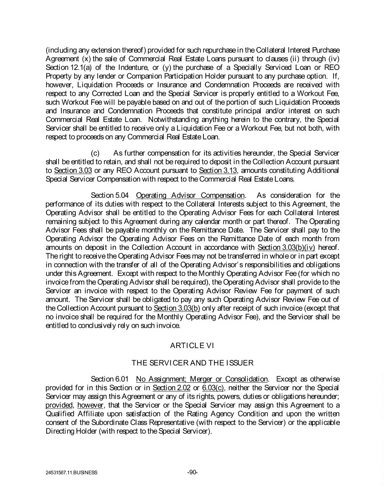 (including any extension thereof) provided for such repurchase in the Collateral Interest Purchase Agreement (x) the sale of Commercial Real Estate Loans pursuant to clauses (ii) through (iv) Section 12.1(a) of the Indenture, or (y) the purchase of a Specially Serviced Loan or REO Property by any lender or Companion Participation Holder pursuant to any purchase option. If, however, Liquidation Proceeds or Insurance and Condemnation Proceeds are received with respect to any Corrected Loan and the Special Servicer is properly entitled to a Workout Fee, such Workout Fee will be payable based on and out of the portion of such Liquidation Proceeds and Insurance and Condemnation Proceeds that constitute principal and/or interest on such Commercial Real Estate Loan. Notwithstanding anything herein to the contrary, the Special Servicer shall be entitled to receive only a Liquidation Fee or a Workout Fee, but not both, with respect to proceeds on any Commercial Real Estate Loan. (c) As further compensation for its activities hereunder, the Special Servicer shall be entitled to retain, and shall not be required to deposit in the Collection Account pursuant to Section 3.03 or any REO Account pursuant to Section 3.13, amounts constituting Additional Special Servicer Compensation with respect to the Commercial Real Estate Loans. Section 5.04 Operating Advisor Compensation. As consideration for the performance of its duties with respect to the Collateral Interests subject to this Agreement, the Operating Advisor shall be entitled to the Operating Advisor Fees for each Collateral Interest remaining subject to this Agreement during any calendar month or part thereof. The Operating Advisor Fees shall be payable monthly on the Remittance Date. The Servicer shall pay to the Operating Advisor the Operating Advisor Fees on the Remittance Date of each month from amounts on deposit in the Collection Account in accordance with Section 3.03(b)(iv) hereof. The right to receive the Operating Advisor Fees may not be transferred in whole or in part except in connection with the transfer of all of the Operating Advisor’s responsibilities and obligations under this Agreement. Except with respect to the Monthly Operating Advisor Fee (for which no invoice from the Operating Advisor shall be required), the Operating Advisor shall provide to the Servicer an invoice with respect to the Operating Advisor Review Fee for payment of such amount. The Servicer shall be obligated to pay any such Operating Advisor Review Fee out of the Collection Account pursuant to Section 3.03(b) only after receipt of such invoice (except that no invoice shall be required for the Monthly Operating Advisor Fee), and the Servicer shall be entitled to conclusively rely on such invoice. ARTICLE VI THE SERVICER AND THE ISSUER Section 6.01 No Assignment; Merger or Consolidation. Except as otherwise provided for in this Section or in Section 2.02 or 6.03(c), neither the Servicer nor the Special Servicer may assign this Agreement or any of its rights, powers, duties or obligations hereunder; provided, however, that the Servicer or the Special Servicer may assign this Agreement to a Qualified Affiliate upon satisfaction of the Rating Agency Condition and upon the written consent of the Subordinate Class Representative (with respect to the Servicer) or the applicable Directing Holder (with respect to the Special Servicer). 24531587.11.BUSINESS -90-