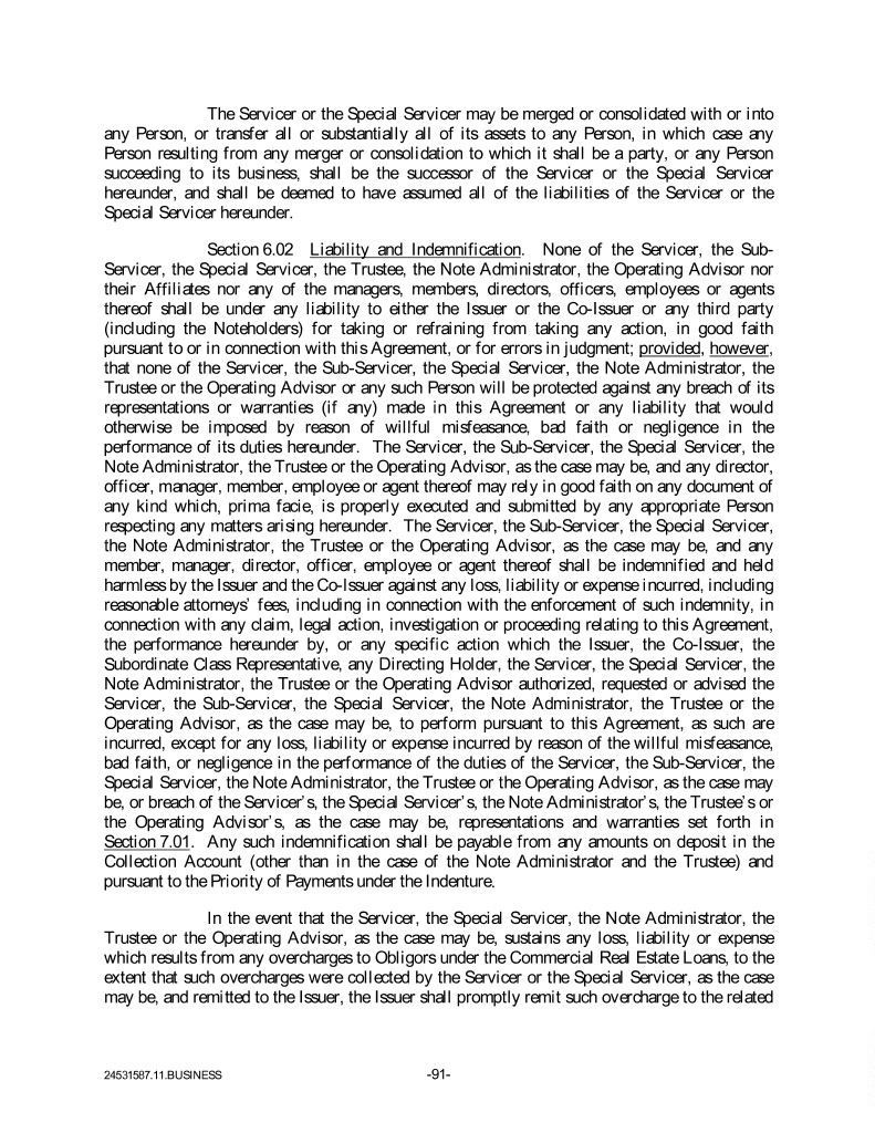The Servicer or the Special Servicer may be merged or consolidated with or into any Person, or transfer all or substantially all of its assets to any Person, in which case any Person resulting from any merger or consolidation to which it shall be a party, or any Person succeeding to its business, shall be the successor of the Servicer or the Special Servicer hereunder, and shall be deemed to have assumed all of the liabilities of the Servicer or the Special Servicer hereunder. Section 6.02 Liability and Indemnification. None of the Servicer, the Sub- Servicer, the Special Servicer, the Trustee, the Note Administrator, the Operating Advisor nor their Affiliates nor any of the managers, members, directors, officers, employees or agents thereof shall be under any liability to either the Issuer or the Co-Issuer or any third party (including the Noteholders) for taking or refraining from taking any action, in good faith pursuant to or in connection with this Agreement, or for errors in judgment; provided, however, that none of the Servicer, the Sub-Servicer, the Special Servicer, the Note Administrator, the Trustee or the Operating Advisor or any such Person will be protected against any breach of its representations or warranties (if any) made in this Agreement or any liability that would otherwise be imposed by reason of willful misfeasance, bad faith or negligence in the performance of its duties hereunder. The Servicer, the Sub-Servicer, the Special Servicer, the Note Administrator, the Trustee or the Operating Advisor, as the case may be, and any director, officer, manager, member, employee or agent thereof may rely in good faith on any document of any kind which, prima facie, is properly executed and submitted by any appropriate Person respecting any matters arising hereunder. The Servicer, the Sub-Servicer, the Special Servicer, the Note Administrator, the Trustee or the Operating Advisor, as the case may be, and any member, manager, director, officer, employee or agent thereof shall be indemnified and held harmless by the Issuer and the Co-Issuer against any loss, liability or expense incurred, including reasonable attorneys’ fees, including in connection with the enforcement of such indemnity, in connection with any claim, legal action, investigation or proceeding relating to this Agreement, the performance hereunder by, or any specific action which the Issuer, the Co-Issuer, the Subordinate Class Representative, any Directing Holder, the Servicer, the Special Servicer, the Note Administrator, the Trustee or the Operating Advisor authorized, requested or advised the Servicer, the Sub-Servicer, the Special Servicer, the Note Administrator, the Trustee or the Operating Advisor, as the case may be, to perform pursuant to this Agreement, as such are incurred, except for any loss, liability or expense incurred by reason of the willful misfeasance, bad faith, or negligence in the performance of the duties of the Servicer, the Sub-Servicer, the Special Servicer, the Note Administrator, the Trustee or the Operating Advisor, as the case may be, or breach of the Servicer’s, the Special Servicer’s, the Note Administrator’s, the Trustee’s or the Operating Advisor’s, as the case may be, representations and warranties set forth in Section 7.01. Any such indemnification shall be payable from any amounts on deposit in the Collection Account (other than in the case of the Note Administrator and the Trustee) and pursuant to the Priority of Payments under the Indenture. In the event that the Servicer, the Special Servicer, the Note Administrator, the Trustee or the Operating Advisor, as the case may be, sustains any loss, liability or expense which results from any overcharges to Obligors under the Commercial Real Estate Loans, to the extent that such overcharges were collected by the Servicer or the Special Servicer, as the case may be, and remitted to the Issuer, the Issuer shall promptly remit such overcharge to the related 24531587.11.BUSINESS -91-