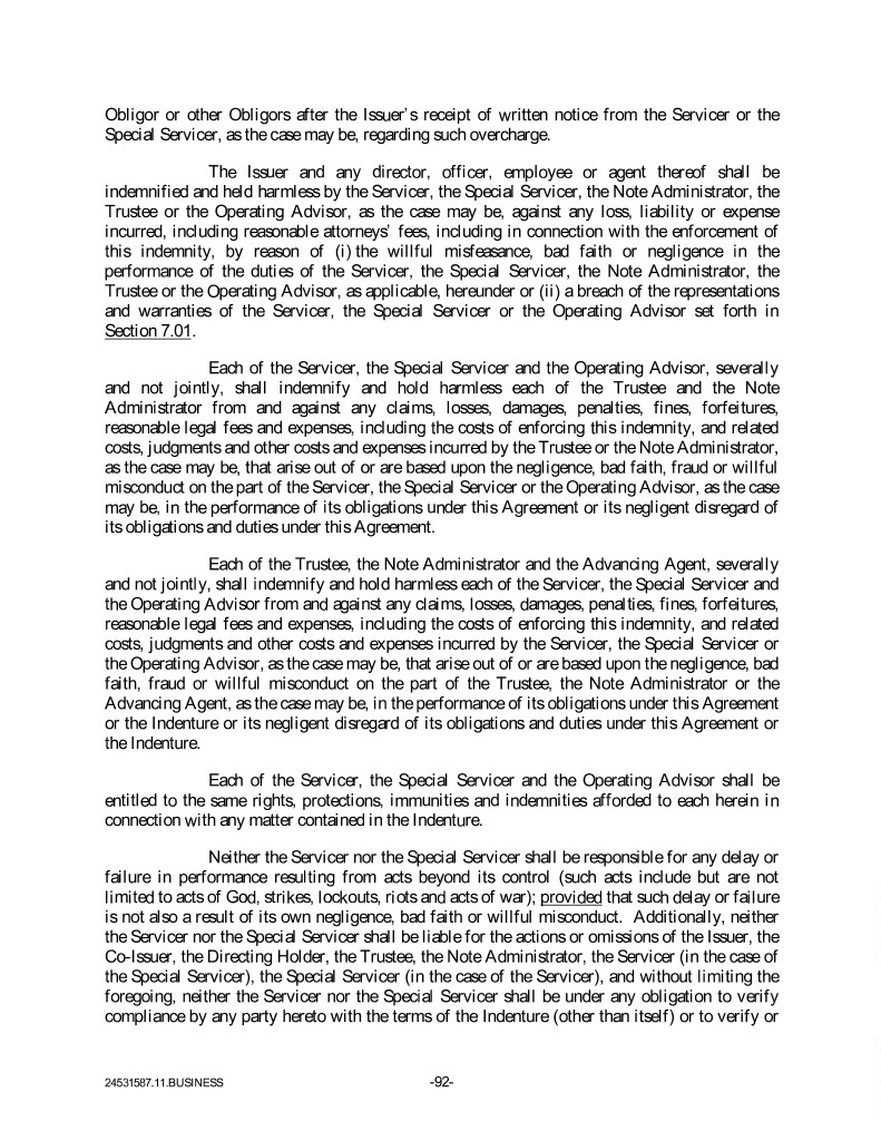 Obligor or other Obligors after the Issuer’s receipt of written notice from the Servicer or the Special Servicer, as the case may be, regarding such overcharge. The Issuer and any director, officer, employee or agent thereof shall be indemnified and held harmless by the Servicer, the Special Servicer, the Note Administrator, the Trustee or the Operating Advisor, as the case may be, against any loss, liability or expense incurred, including reasonable attorneys’ fees, including in connection with the enforcement of this indemnity, by reason of (i) the willful misfeasance, bad faith or negligence in the performance of the duties of the Servicer, the Special Servicer, the Note Administrator, the Trustee or the Operating Advisor, as applicable, hereunder or (ii) a breach of the representations and warranties of the Servicer, the Special Servicer or the Operating Advisor set forth in Section 7.01. Each of the Servicer, the Special Servicer and the Operating Advisor, severally and not jointly, shall indemnify and hold harmless each of the Trustee and the Note Administrator from and against any claims, losses, damages, penalties, fines, forfeitures, reasonable legal fees and expenses, including the costs of enforcing this indemnity, and related costs, judgments and other costs and expenses incurred by the Trustee or the Note Administrator, as the case may be, that arise out of or are based upon the negligence, bad faith, fraud or willful misconduct on the part of the Servicer, the Special Servicer or the Operating Advisor, as the case may be, in the performance of its obligations under this Agreement or its negligent disregard of its obligations and duties under this Agreement. Each of the Trustee, the Note Administrator and the Advancing Agent, severally and not jointly, shall indemnify and hold harmless each of the Servicer, the Special Servicer and the Operating Advisor from and against any claims, losses, damages, penalties, fines, forfeitures, reasonable legal fees and expenses, including the costs of enforcing this indemnity, and related costs, judgments and other costs and expenses incurred by the Servicer, the Special Servicer or the Operating Advisor, as the case may be, that arise out of or are based upon the negligence, bad faith, fraud or willful misconduct on the part of the Trustee, the Note Administrator or the Advancing Agent, as the case may be, in the performance of its obligations under this Agreement or the Indenture or its negligent disregard of its obligations and duties under this Agreement or the Indenture. Each of the Servicer, the Special Servicer and the Operating Advisor shall be entitled to the same rights, protections, immunities and indemnities afforded to each herein in connection with any matter contained in the Indenture. Neither the Servicer nor the Special Servicer shall be responsible for any delay or failure in performance resulting from acts beyond its control (such acts include but are not limited to acts of God, strikes, lockouts, riots and acts of war); provided that such delay or failure is not also a result of its own negligence, bad faith or willful misconduct. Additionally, neither the Servicer nor the Special Servicer shall be liable for the actions or omissions of the Issuer, the Co-Issuer, the Directing Holder, the Trustee, the Note Administrator, the Servicer (in the case of the Special Servicer), the Special Servicer (in the case of the Servicer), and without limiting the foregoing, neither the Servicer nor the Special Servicer shall be under any obligation to verify compliance by any party hereto with the terms of the Indenture (other than itself) or to verify or 24531587.11.BUSINESS -92-